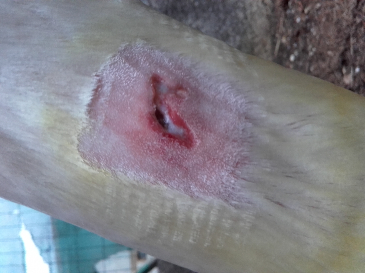 | Dire merci | la véto à "fouillé" la plaie, elle l'aurait trouvé non? une radio serait nécessaire? pour l'arc de cercle mon hypothèse serait dans le cas d'un trou de plomb que le poulain gêné par la blessure se serait ensuite gratté provoquant la déchirure en V |