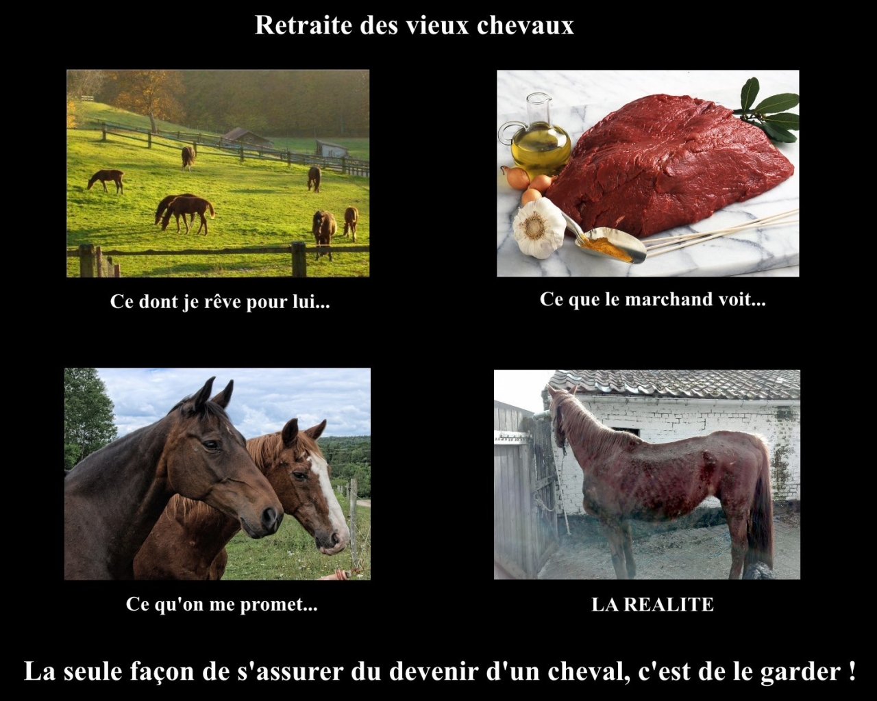| Dire merci | je pense aussi à l'affiche avec le rotweiller qui a circulé si vous voulez ça (photo d'un cheval pimpant avec lequel on s'éclate) mais que vous n'etes pas prêt à assumer ça (photo d'un cheval clairement à la retraite) que vous allez faire ça (photos d'une annonce de don et d'un cheval abandonné) on pourrait rajouter : et qu'il finira comme ça (barquette de viande) alors prenez ça (cheval a bascule) |