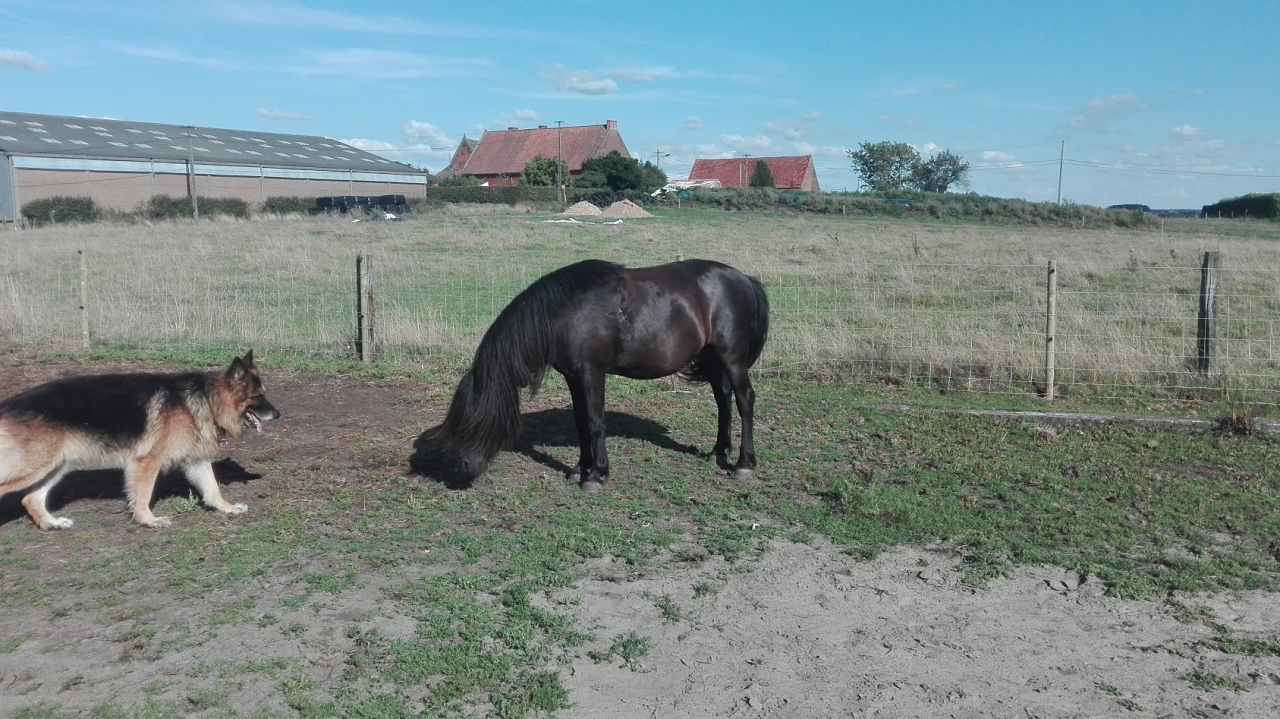 DéconnectéDire merci | l'été est haute saison pour moi, j'ai presque fini je vous raconterai plus tard (que des chevaux maigres rien de blessures spectaculaires) En attendant voici un Miko trop gras qui fait son étalon avec le chien ![]() |
