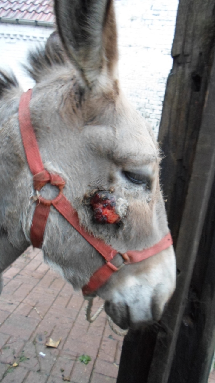 DéconnectéDire merci | les yaka fokon (enlever son oeil) c'est toujours facile avec le portefeuille des autres ... ce n'est vraiment pas la priorité. Il faut d'abord arriver au bout de l'infection généralisée (elle est gonflée de la base de l'oreille jusqu'à la commissure des lèvres, y a du pus qui sort à certains endroits mais pas vraiment d'abcès qui se vide). si on arrive à ça on verra comment on peut réduire (opérativement) le sarcoïde pcq de cette taille là il ne partira pas tout seul même avec les meilleure des crèmes et après on verra comment se comporte l'oeil. C'est un très sale endroit pour opérer pcq on ne peut pas aller bien profond et que donc le risque de récidive est énorme ... les choses seront faites dans l'ordre avec évaluation entre chaque étape de la faisabilité/viabilité ... Pour le gamin (je ne sais pas s'il est hongre ou pas) je verrai avec la véto avec quoi on peut tenter de ligaturer ce melon ... mais dans l'état où il est on ne peut pas faire grand chose, faut d'abord voir s'il arrive à reprendre le dessus |