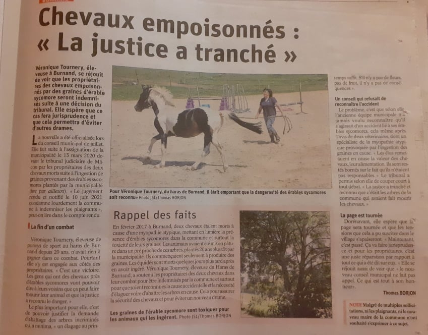 DéconnectéDire merci | Chez nous aussi recrudescence jument dcd en novembre. J'arrache les plantules faute de mieux. Pas d'arbre dans le pré mais caché derrière un mur à 8 m du début du pré mais comme ça vole j'en ai trouvé sur le bord de la route qui borde le coin de leur pré et un peu à l'intérieur avec la pluie j'ai pu en arracher pas mal avec la racine. Je reste vigilante mais cela fait des années que ma jument est dans ce pré et jamais eu de soucis. Elle est rentrée au box le soir ou en journées trop chaudes. Toute façon dans ma région il y a pleins d'érables depuis des années et depuis des années des chevaux en paturage on a eu 1 seul cas en novembre (déjà trop je l'avoue mais jument fragilisée niveau du foie et qui aurait du je pense être rentrée plus vite pour recevoir du foin en complément elle a du manger l'herbe plus rase et donc manger des samares je ne vois que cette explication car pourquoi aucun cas depuis des années et on a eu chez nous la sécheresses dans ses années. Je penche aussi pour une faiblesse chez certains chevaux …. |