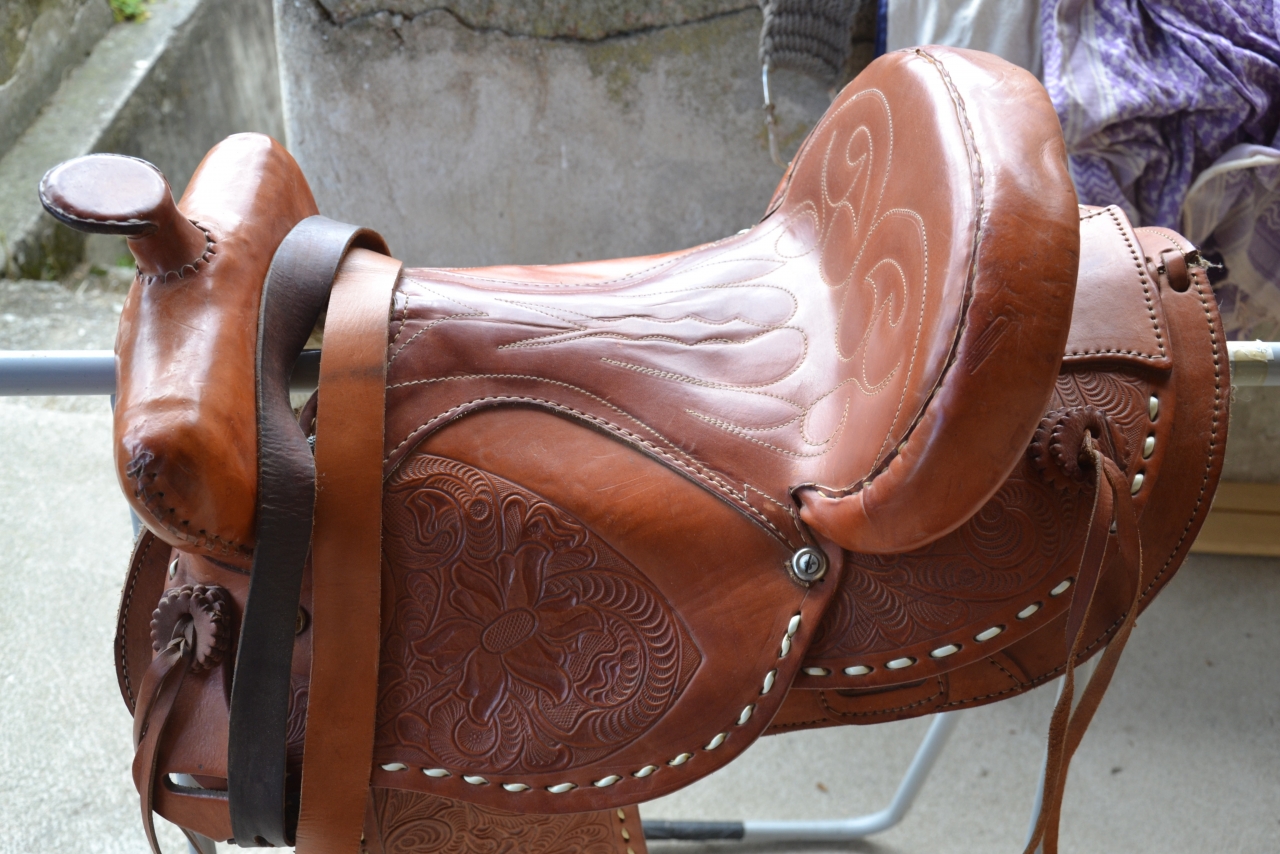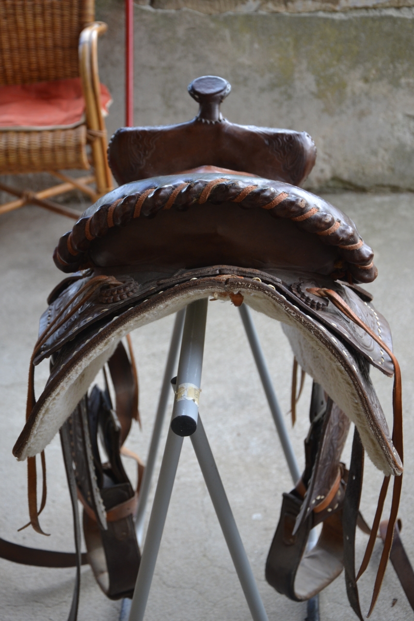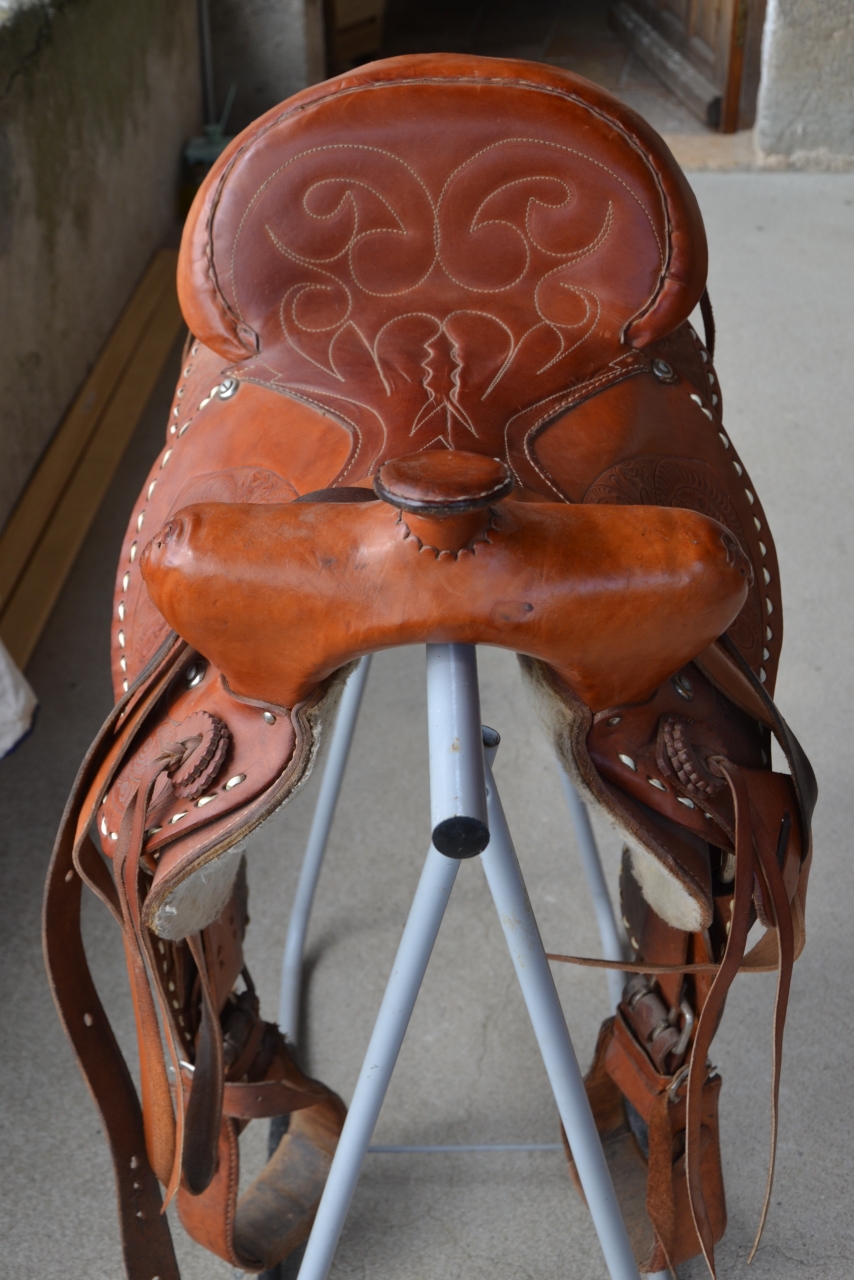 | Dire merci | 50chaque. Et ce serait déjà bien. ça ressemble à des selles poney fabriquées en asie ,à la chaine avec des cuirs de faible qualité. sinon y'à toujour de quoi trouver des infos sur le forum western. Par exemple comment prendre la "taille": en général on prends la longueur du siege, (la place entiere du cul-cul) donc de mi hauteur de corne à début du troussequin et pour faire simple on l'exprime en cm. pour la taille de la selle, (sous nos latitudes que des dobes qui vont pas sur les shets alors que c'est bien souvent leur destination) ((notament parce que il faudrait fabriquer des garrots aux shets)) L'ouverture se mesure normalement entre les rosaces qui se trouvent à l'avant de la selle qui s'appellent conchos |