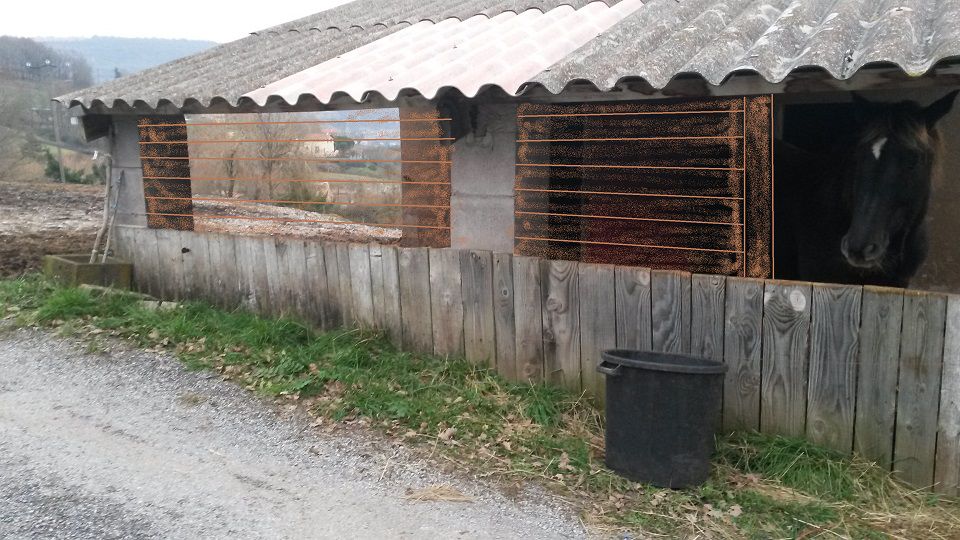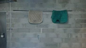 | Dire merci | Pour le DIY niveau sellerie, ici on a repris de vieux tubes en plastique souple style drain, passer une tige style cintre déplié dedans, et suspendu le tout au plafond. C'est pas beau, mais c'est très efficace pour accrocher tapis et couvertures. Et j'avais récupéré un palox en bois suite à des travaux, il est percé au fond (donc eau ou poussière tombent), je donne le foin là dedans, ça évite le gaspillage. Pour 3 chevaux, je pense qu'il te faudrait 3 palox. Ah, et un truc bien pratique, dans notre grand pré d'été, il y a un sas, ça permet de rentrer en tracteur sans galérer avec les chevaux qui te tournent autour. |