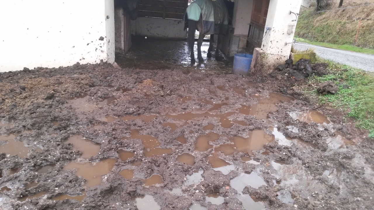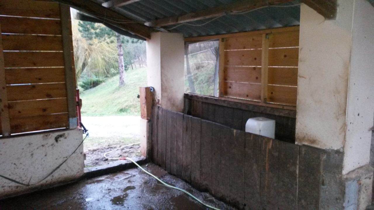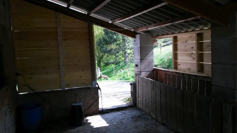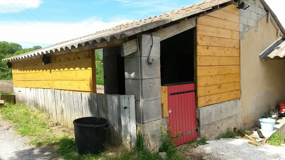 | Dire merci | L'ABRI il s'agit donc du seul endroit ou le sol est en dur... Par principe en arrivant ma jument s'est accaparé le box et mon cheval l'abri.. Alors c'était sympa, mais très ouvert et aux quatres vents donc...gros problème de vent, d'infiltration d'eau, de soleil l'été... les photos du projet ![]() ![]() Bref on décide de mieux isoler cette partie pour le confort de mon hongre, donc on fait un bardage bois, ce qui permet de le fermer sur trois côté, on laisse ouvert l'accès au paddock et on détruit le petit muret entre les deux (trop dangereux à cause des évacuations d'urgence que ma jument fait faire à mon hongre!), et on fabrique la porte ça donne ça : ![]() ![]() ![]() ![]() je retape aussi la mangeoire intérieure et défonce la seconde afin de gagner un peu de place et d'y mettre le bac de flotte, proche de la sortie, (toujours les pbs d'évacuation d'urgence ordonnés par la vieille!) lol LES PLUS : j'aime bien le rendu, très bon ombrage l'été, les chevaux s'y plaisent pour s'abriter de la pluie, ont gardé un visuel sur la maison, le paddock... LES MOINS : Gros pbs de boue à l'entrée de l'abr, côté paddock... PROJET : faire une pente de toit ou un prolongement de toit côté paddock pour essayer de limiter la boue due au passage incessant des chevaux....la stabilisation me couterai je pense trop cher pour le moment... et j'y pense : les graviers que vous voyez devant l'abri ...bon ba argent foutu par les fenêtre...même en ayant bien décaisser, foutu des cailloux plus gros dessous, la boue à repris le dessus en un hiver, on les voit presque plus..mais entre mes passage et ceux des chevaux...c'est foutu ! important : Prévoir des écoulement d'eau sur la dalle(pour laver la dalle, nettoyer l'urine, ou le trop plein de flotte du paddock comme pour moi...) les prévoir bien grandes pour qu'elles ne s'obstruent pas du moindre crottin ou bout de foin...moi c'est un réel pbs, idem une légère déclivité pour faciliter l'écoulement c'est pas du luxe, ici ça manque, je dois tout pousser au balais |