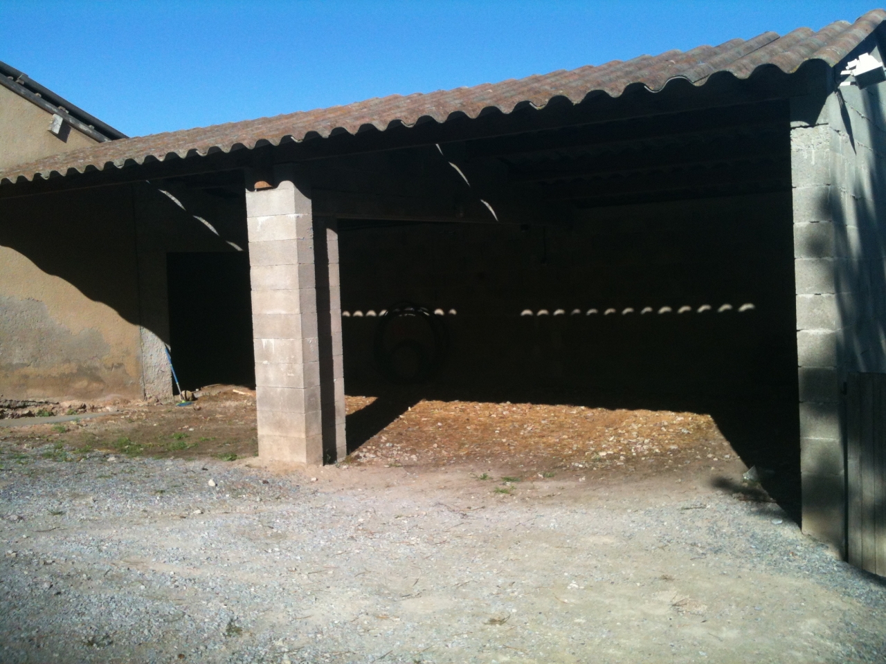 DéconnectéDire merci | Un autre truc que j'ai oublié de mentionner plus haute, dans le batiment qu'on est entrain de constuire, j'ai fait mettre une poutrelle métallique au dessus d'un boxe si il y a besoin de pendre un cheval. Expérience du fourbu à pendre pour soulager. |