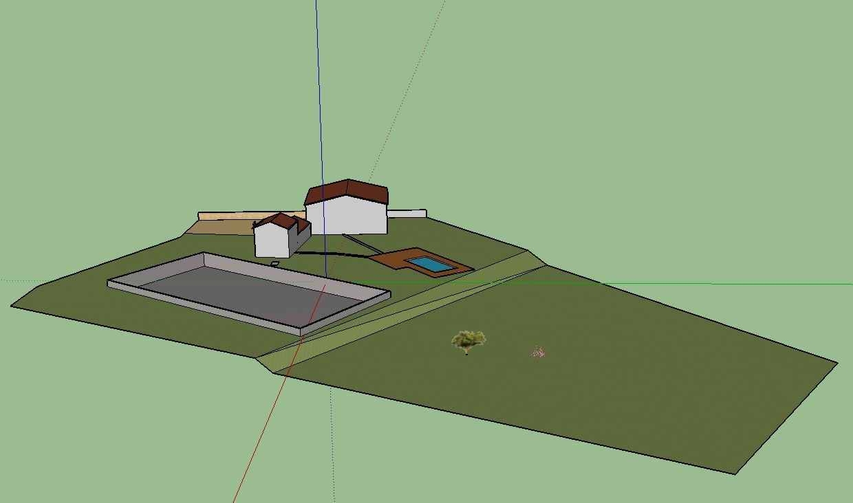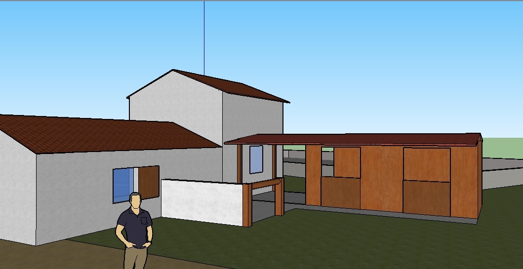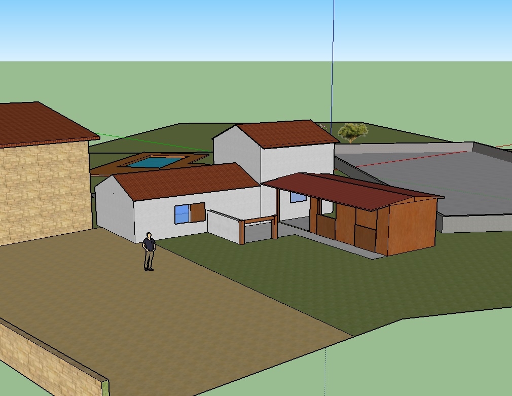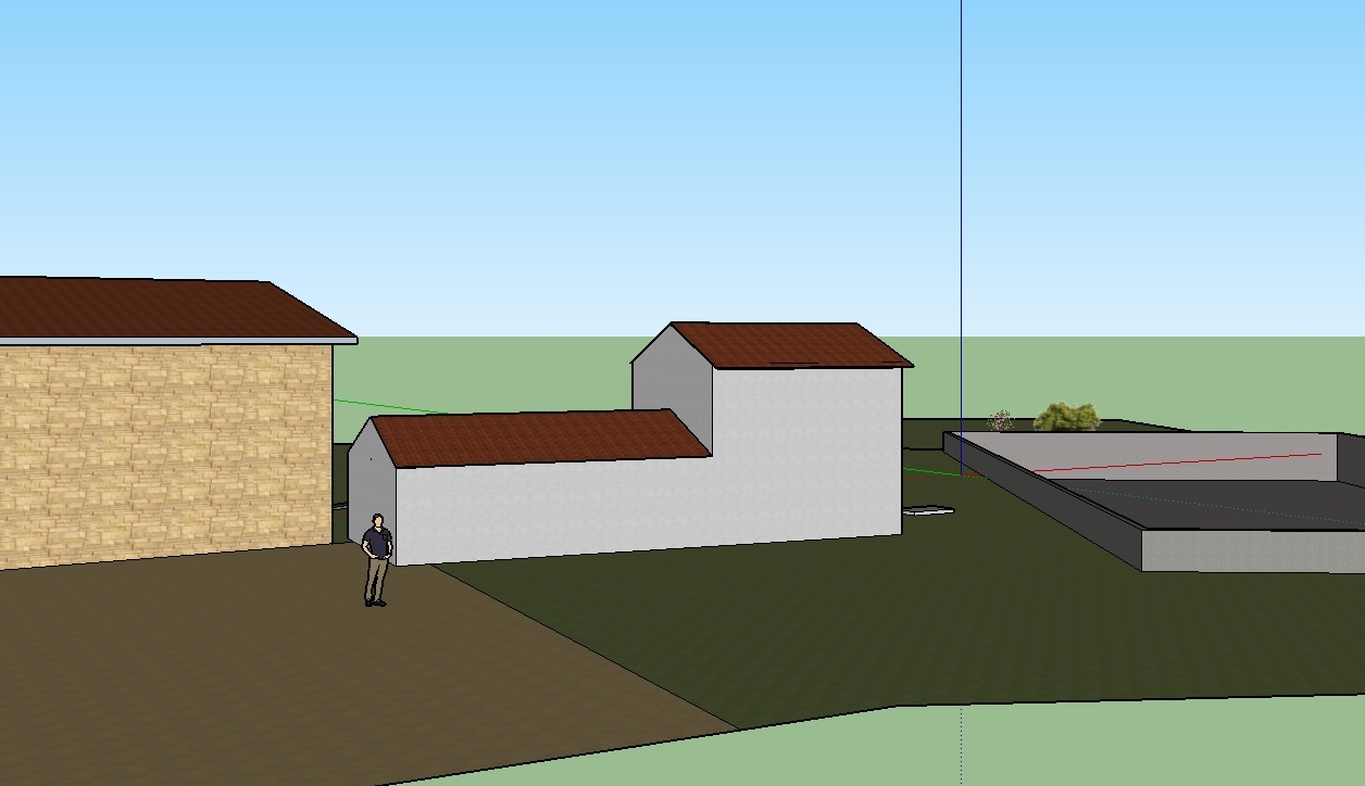 | Dire merci | Oui, c'est sur. Par rapport au plan d'urbanisme, je pourrai coller l'écurie à la face nord de la maison, mais ce n'est ensuite pas accessible en voiture ni tracteur (enfin si, mais en défonçant le jardin!). J'ai géolocalisé ma maison dans sketchup, pour récupérer le relief mais j'arrivais pas ensuite à intégrer des choses dessus... Je ne maitrise pas assez, et je manque de temps pour multiplier les essais. Le garage est traversant, il donne côté jardin, côté cour, et si j'ouvre la fenêtre qui donne dans le auvent de l'écurie en mettant une porte il donnera aussi sur cette partie. Il fait presque 50m² (sans compter l'étage ou j'envisage un truc type club house pour le plaisir), avec 3 "pièces" distinctes. |