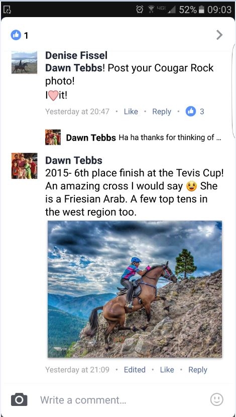 | Dire merci | Je viens de tomber sur ca sur FB, j'ai pense que ca pourrait en intéresser certains:![]() Une arabo-frisonne qui a fini 6eme de la Tevis Cup, la course d'endurance la plus dure des Etats-Unis (160km), ce n'est tout de meme pas rien. Apres, un modele visiblement tres tres sport... |