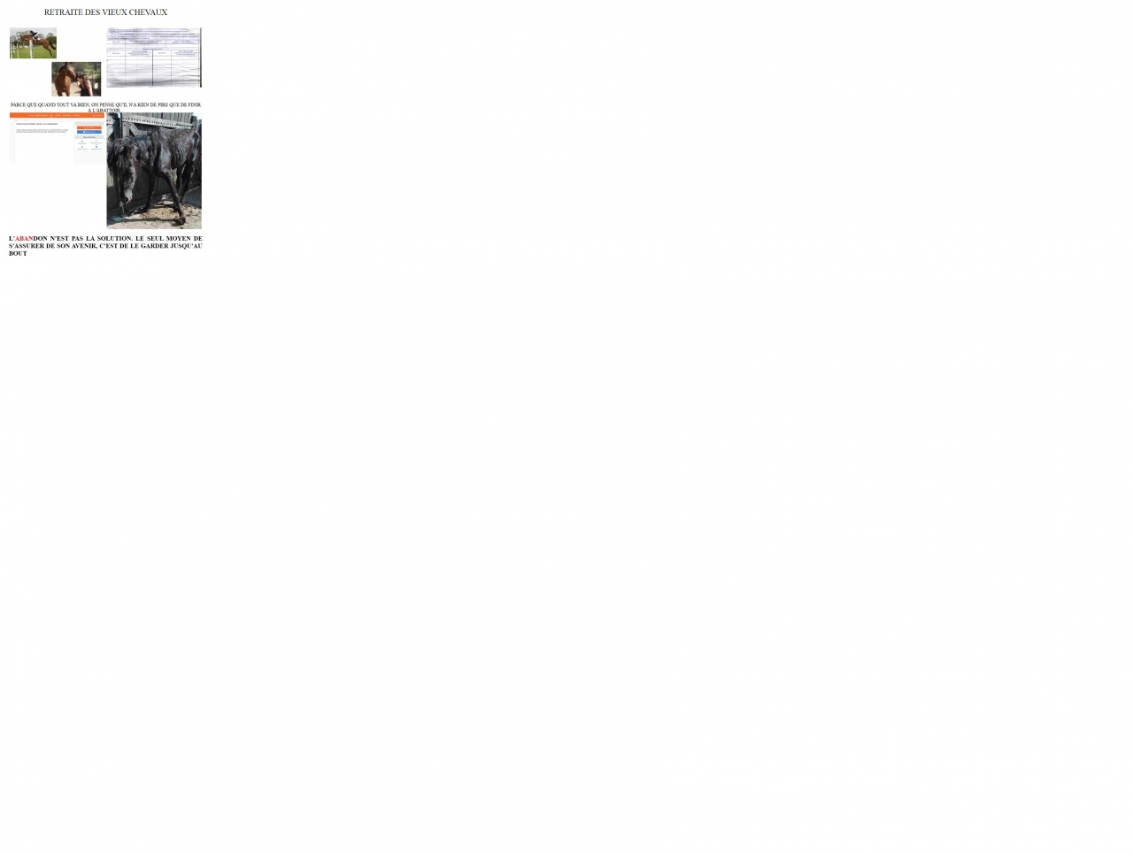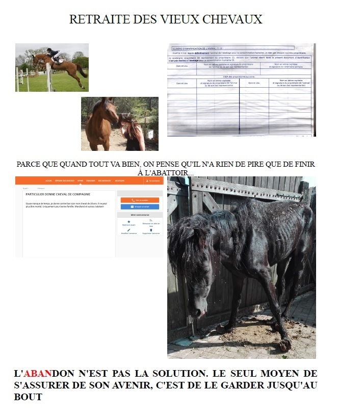| Dire merci | moi c'est la phrase de fin qui me choque : car ça revient à dire qu'on ne peut jamais vendre son cheval ...et on ne devine pas que c'est un cheval devenu inutilisable , car les utilisables sont vendables . je sais pas comment expliquer : genre "n'abandonnez pas votre compagnon vieux ou réformé" : les photos sont assez parlantes pour montrer qu'on devrait toujours prendre en charge son cheval jusqu'à la fin, que ce soit une pension, ou le garder chez soi |