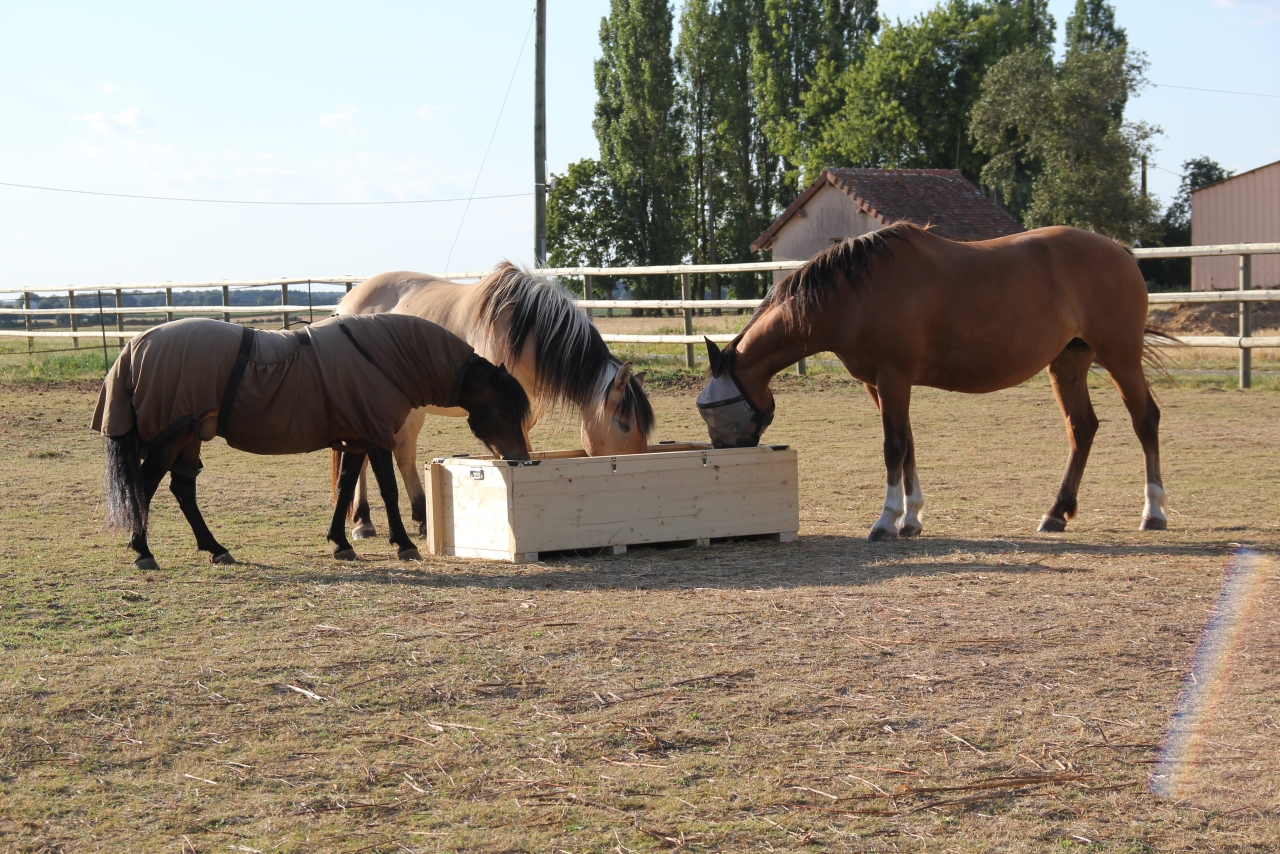 | Dire merci | Je pense que le plus simple, c'est - 3 chevaux = 3 coffres : ce sera plus facile à gérer et ils seront plus solides. - pour le trempage : le tremper dans le coffre, je pense que c'est pas une bonne idée : il va te falloir de coffre étanches ils vont vite s'abimer. En plus, le foin ne va pas bien s'égoutter et vite prendre un goût. À ta place, je tremperais à part puis je mettrais dans le coffre, c'est ce que je fais. - Pour tremper : je mets en filet, j'immerge quelques minutes (le temps dépend de l'objectif), je suspends pour égoutter puis je donne à mes chevaux (pour le dartmoor, tu peux mettre le filet dans le coffre, ça ralentira son repas). Si tu ne veux pas mettre en filet (ça prend du temps), tu peux récupérer une vieille baignoire, le tremper dedans puis le répartir dans les coffres. Tu peux même mettre une grille au fond des coffres, pour être sur que le foin s'égoutte bien. |