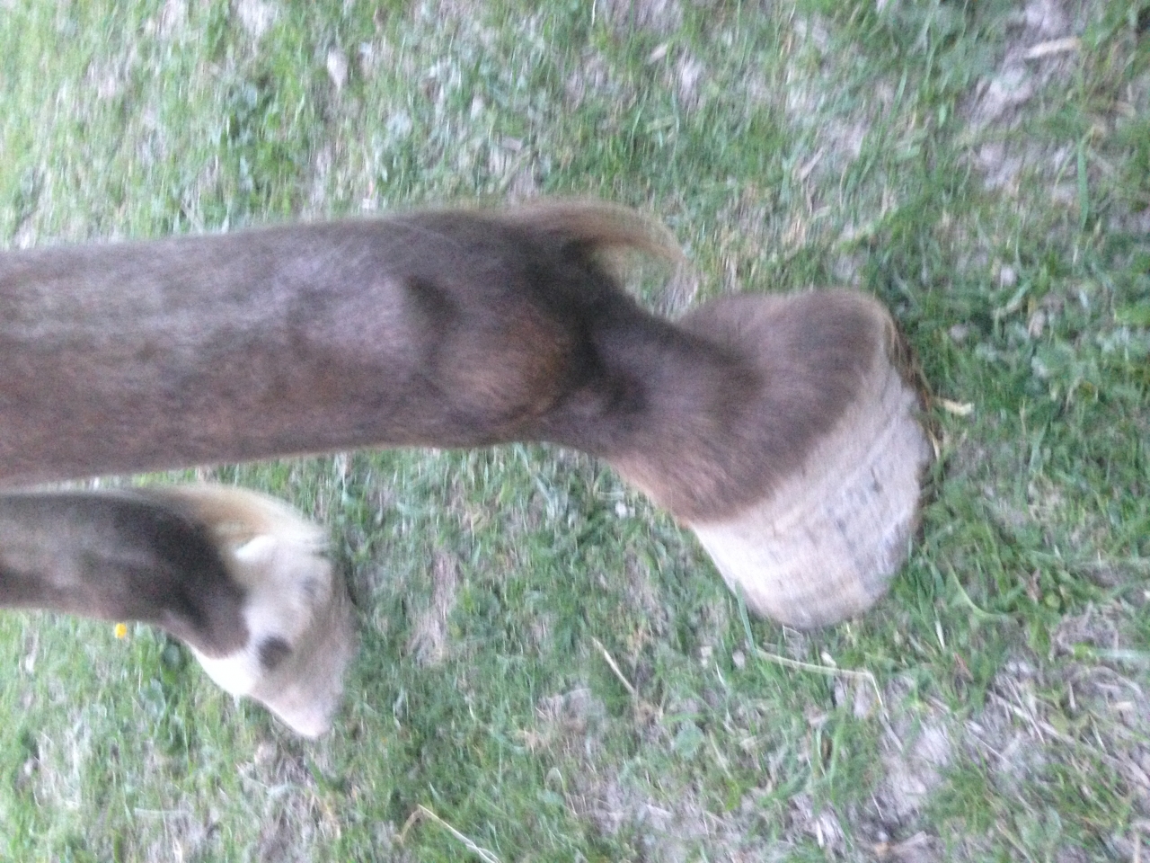 | Dire merci | Be quand même,vu qu'il est trop gros,Je me taperais quand même des radios pour être sûre que pas de terrain de fourbure et j'arrêterais illico le foin. La molette est énorme. Tu as forcé hier? |