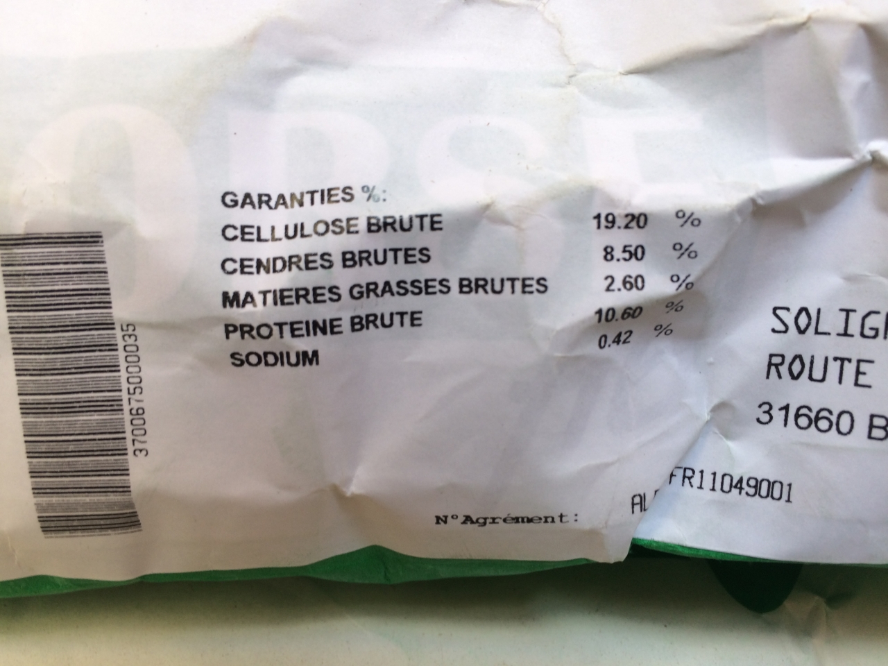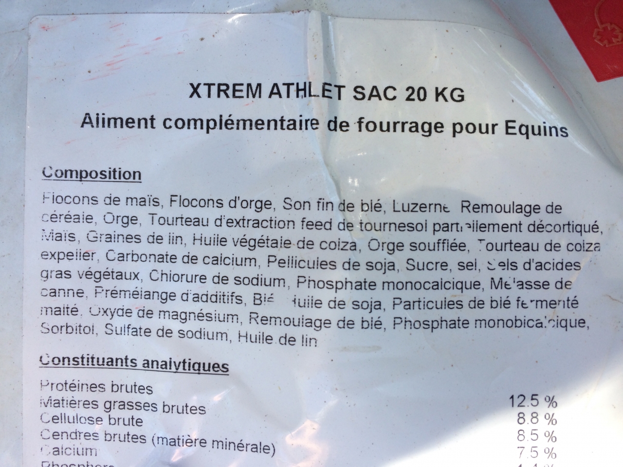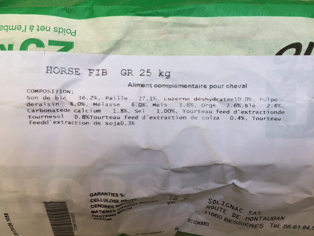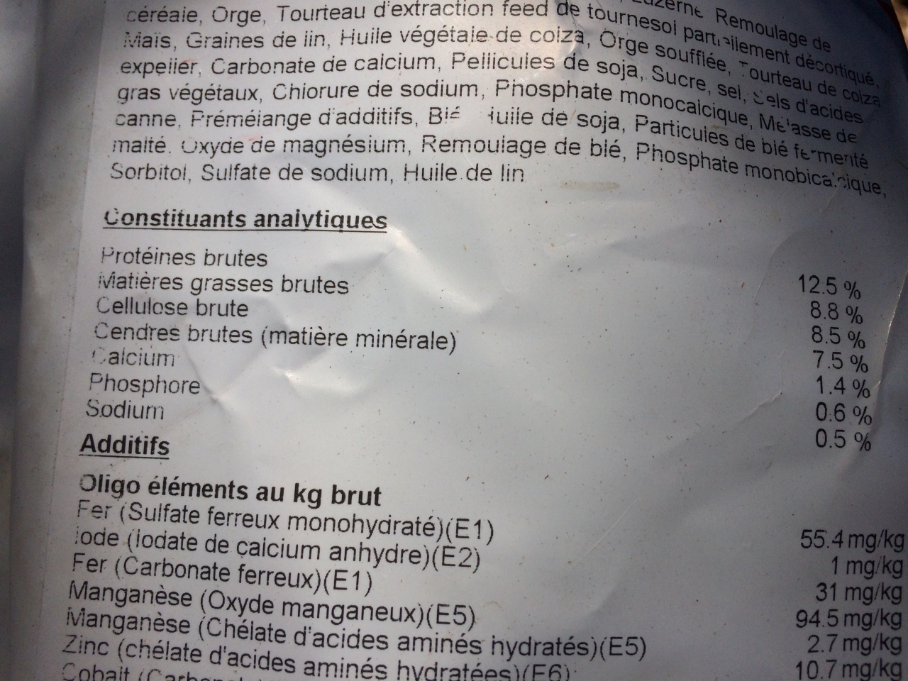 DéconnectéDire merci | composant principal son de blé, il y en a qui osent ... et en deuxième paille ... ce serait bien trempé pour des vieux édentés qui n'arrivent plus à manger du foin ... ce ne sont quasi que des fibres (et encore pas de très bonne qualité), vaut mieux du foin à volonté que de donner ça ... je ne savais même pas que ça pouvait servir de nourriture à un cheval ... et à mon avis le ration Ca/P doit être pas triste, ils n'osent même pas le mettre dessus Pour moi une bonne ration c'est de l'orge et de la luzerne, un peu de maïs, un peu de son et un apport en graisse (tournesol, soja, maïs) et le moins de mélasse possible |