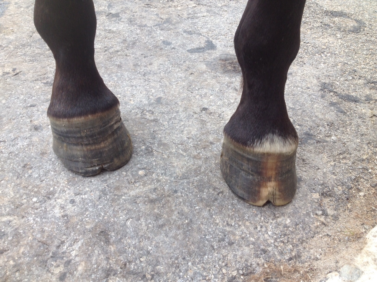 DéconnectéDire merci | Ah si, moi ça me choque +++++++ Ton maréchal ne sait pas parer Nirvelli Dieu sait que je ne suis pas une spécialiste, mais c'est catastrophique L'alignement ne peut pas etre respecté la, tes pieds sont droits Je vais te dire, je me suis faite avoir une fois il y a quelques années par un maréchal soit disant orthopédique, mon véto qui me connaissait bien m'a passé un vrai savon pour ne pas avoir réagi avant et pourtant c'était largemnet moins pire que ça! Il n'a rien rectifié ton maréchal!!! Et tu as vu cette espèce de "cassure" au milieu des antérieurs? Je pense que ça traduit le défaut de pression sur les pieds de cette forme droite |