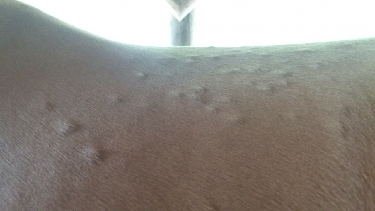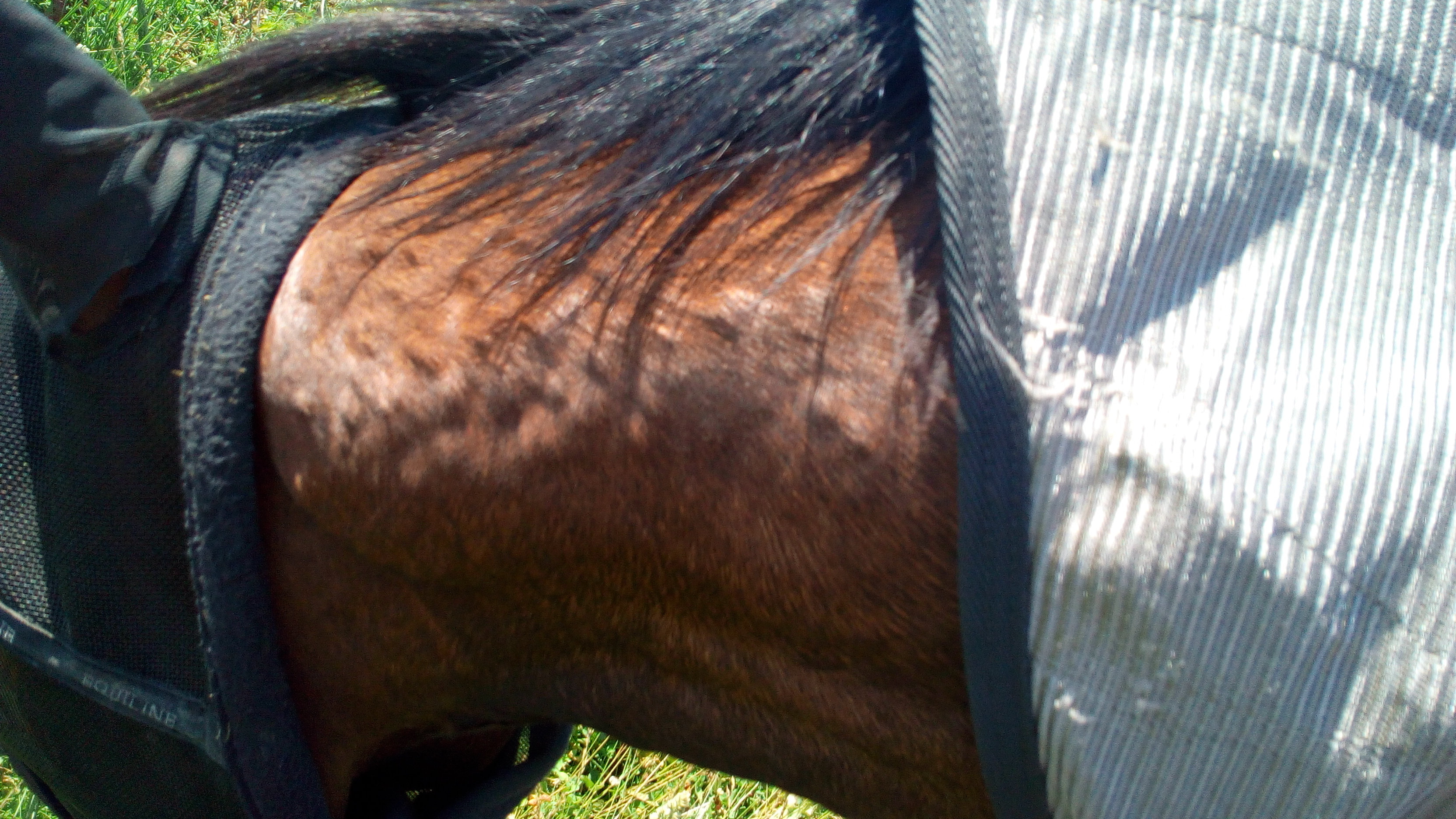 | Dire merci | Ma jument dermiteuse me fait ça très régulièrement au printemps... urticaire un peu partout ! Elle a sa couverture anti dermite horseware, ça tient chaud mais ça doit être moins pire que de se gratter à sang ![]() |