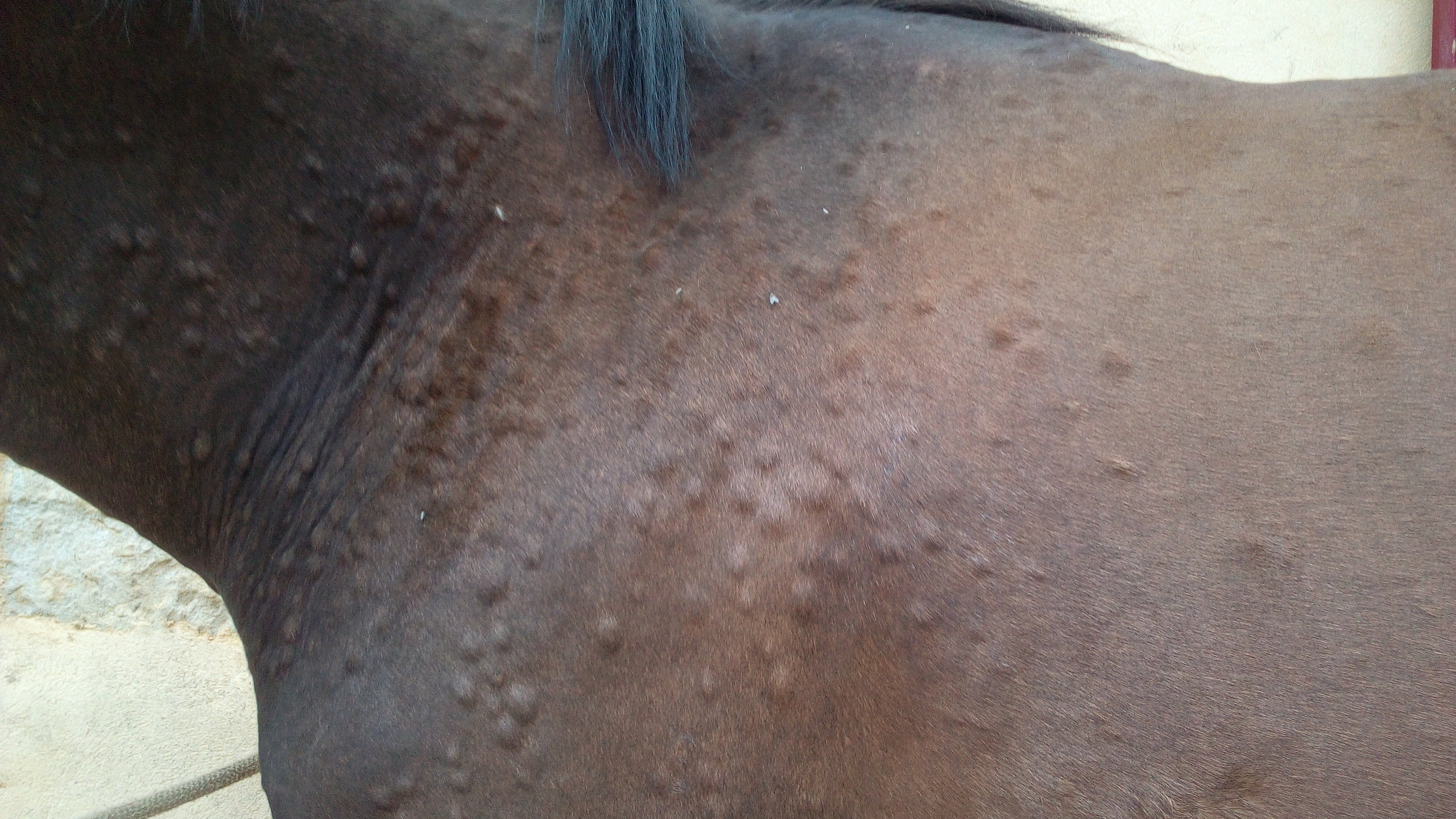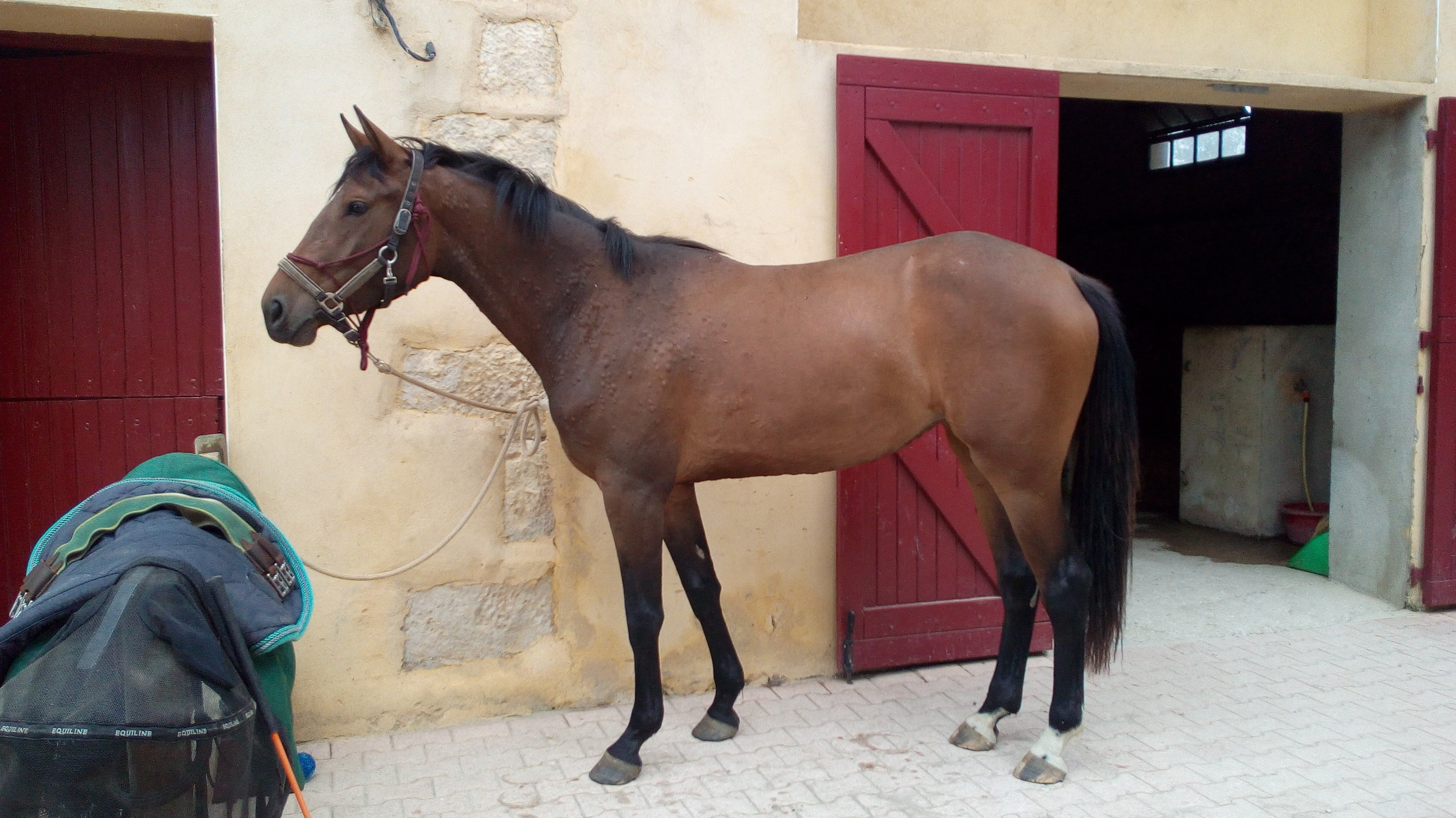 | Dire merci | Bonjour tout le monde J'ai déménagé ma jument de trois ans du paddock au pré la semaine dernière et elle a plein de boutons depuis, et encore plus impressionnant aujourd'hui (voir photo ) C'est localisé sous le ventre , encolure et épaules ... pour moi ça ressemble plus à des piqures mais qu'en pensez vous ? Vous avez déjà eu la même chose ? J'ai demandé à son éleveuse et apparemment elle n'avait jamais réagi comme ça , mais sa mère oui à cause d'une plante pendant les deux jours qui suivaient les changements de pré l'été. Je lui met actuellement un spray aux huiles essentielles mais je pense passer à l'emouchine forte pour plus d'efficacité... Vous en pensez quoi ? ![]() Merci d'avance pour vos réponses ![]() ![]() |