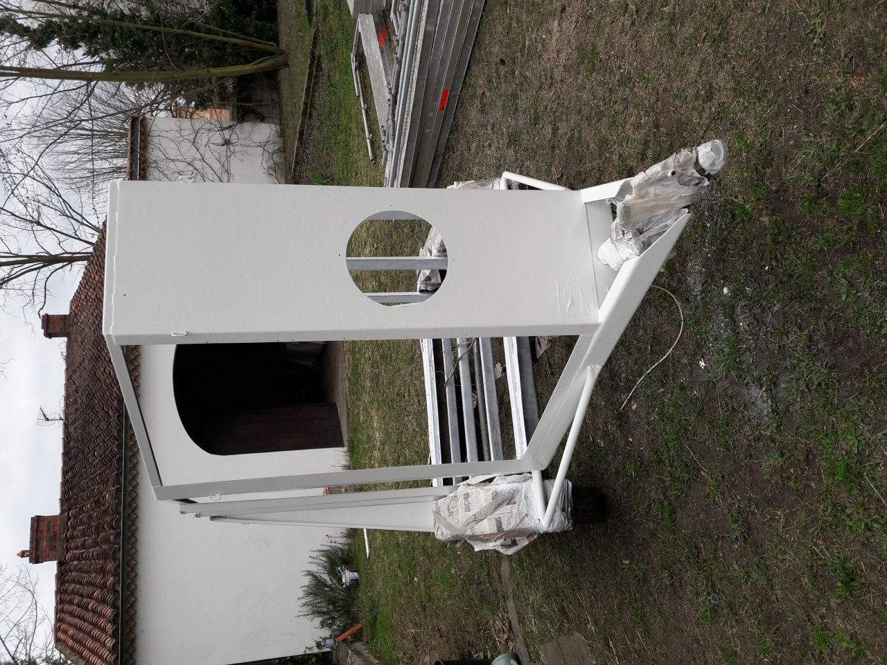 DéconnectéDire merci | En parallèle le chapeau est retiré , la structure métallique du toit repeinte avec une peinture anti rouille car c'est la rouille qui a causé les trous de la bâche. Les trous sont réparés grâce à des bandes coupées dans une autre bâche et recollées dessus |