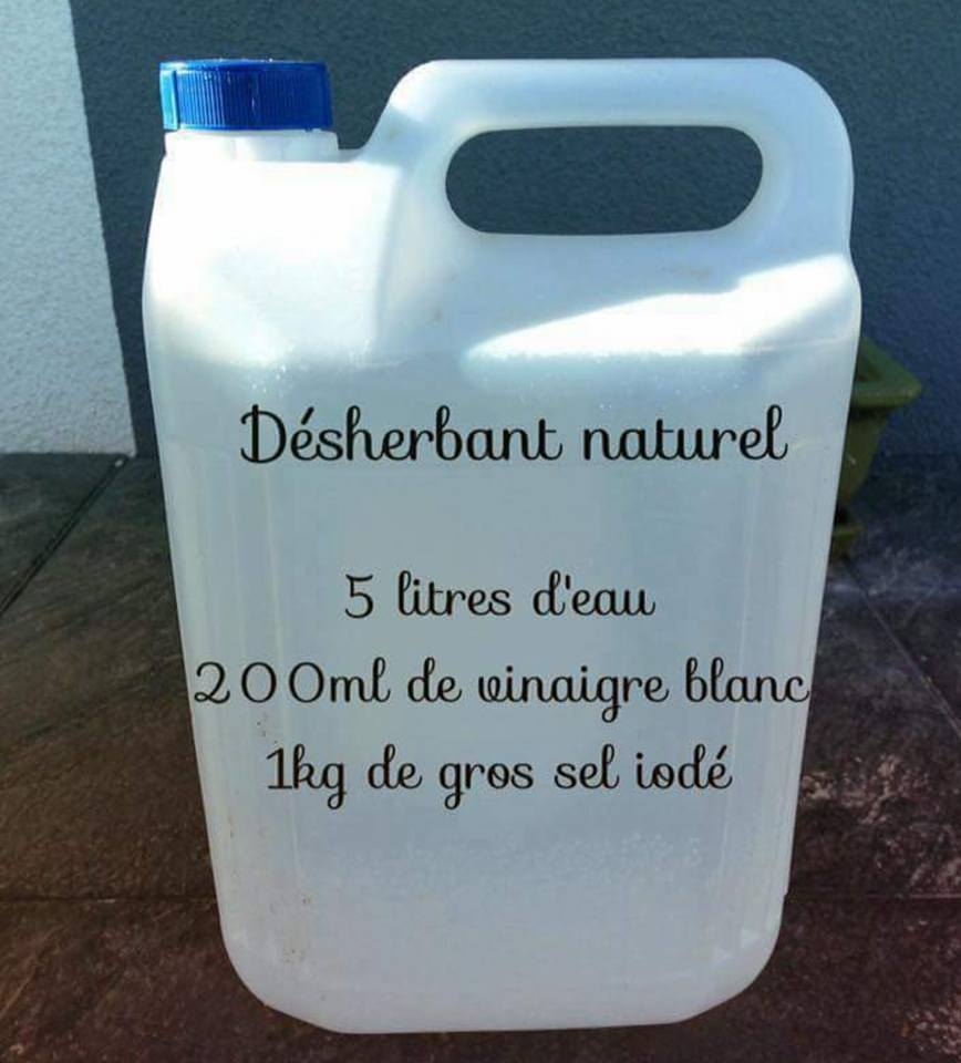 DéconnectéDire merci | voila une recette de desherbant naturellles 5 l d'eau 200 ml de vinaigre 1 poignee de gros sel bien melanger le tous et pulveriser régulièrement |