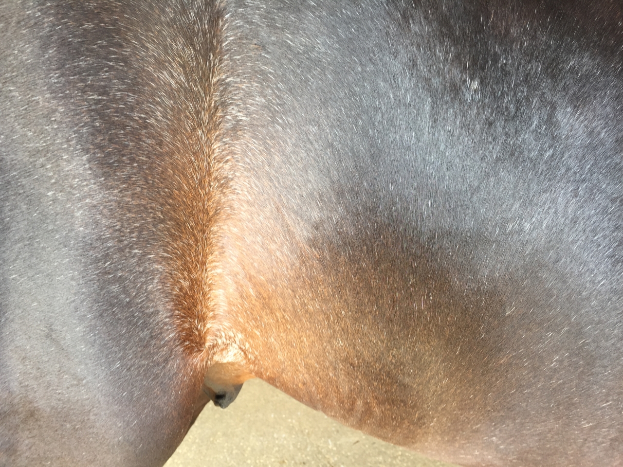 | Dire merci | Poils blancs qui apparaissent un peu partout avec l'âge: c'est comme pour les humains, cela commence très tôt (bien avant 10 ans chez le cheval) sans qu'on le remarque vraiment, puis se développe progressivement. Lors d'une inspection vétérinaire à l'occasion d'un concours international, j'ai vu un vétérinaire qui s'était muni d'un stylo rouge pour ajouter les poils blancs sur le signalement dans les livrets: il en ajoutait pour presque pour tous les chevaux. |