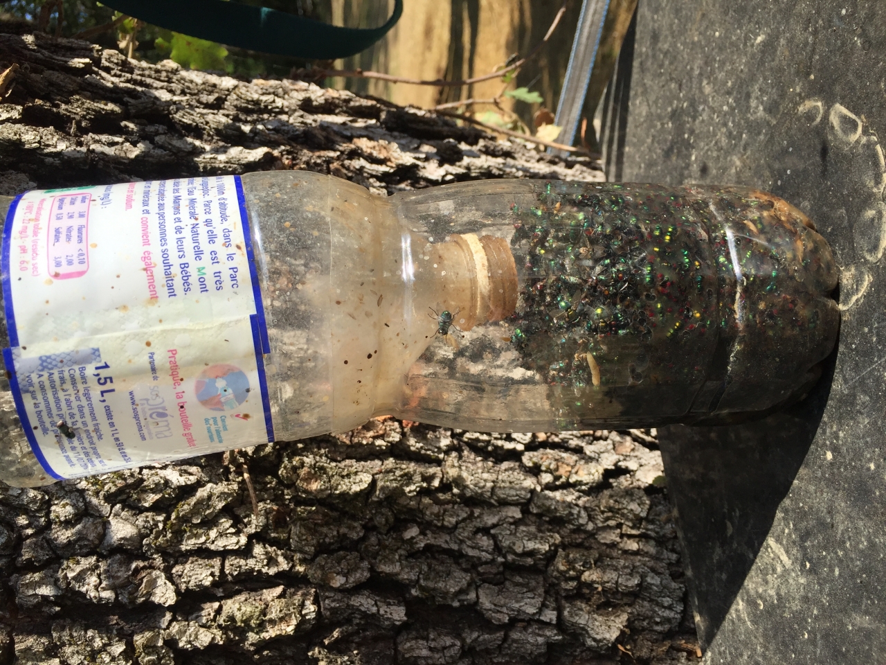 | Dire merci | On utilise des pieges avec des fruits pourris et du cidre, ça attire mouches, taons, guêpes et frelons ![]() Et un autre truc plus chimique ( qui sent les glandes annales de chat ) et qui marche d'enfer sur les mouches! Nous avons pesé les bestioles, 1kg 2 de mouches en 1 semaine.... |