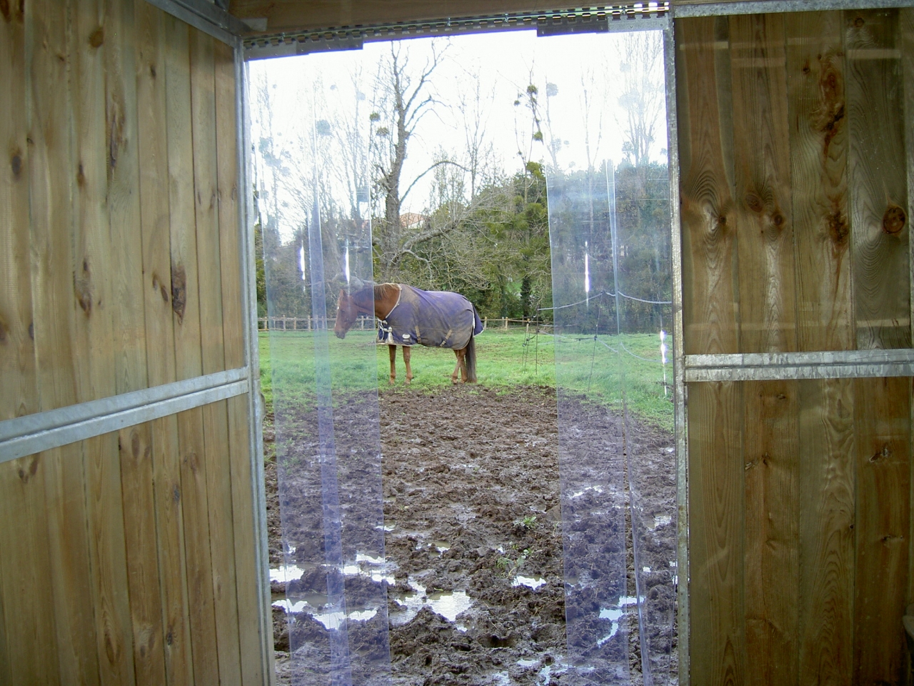 | Dire merci | Mon mari a installé ça en 2013 sur notre barn , et c'est tres resistant . Cela coupe du vent mais par tres grand vent cela fait beaucoup de bruit. Les chevaux au debut ont tres peur mais s'y habituent extrêmement vite (au debut je laisse un passage au milieu) et ensuite ils passent sans probléme. Autre avantage l'été , cela laisse les insectes dehors. ![]() ![]() Chez nous c'est fixe , avec les chevaux je ne crois pas trop aux trucs sophistiqués et en plus , on peut enlever ou remettre des lanieres tres facilement. |