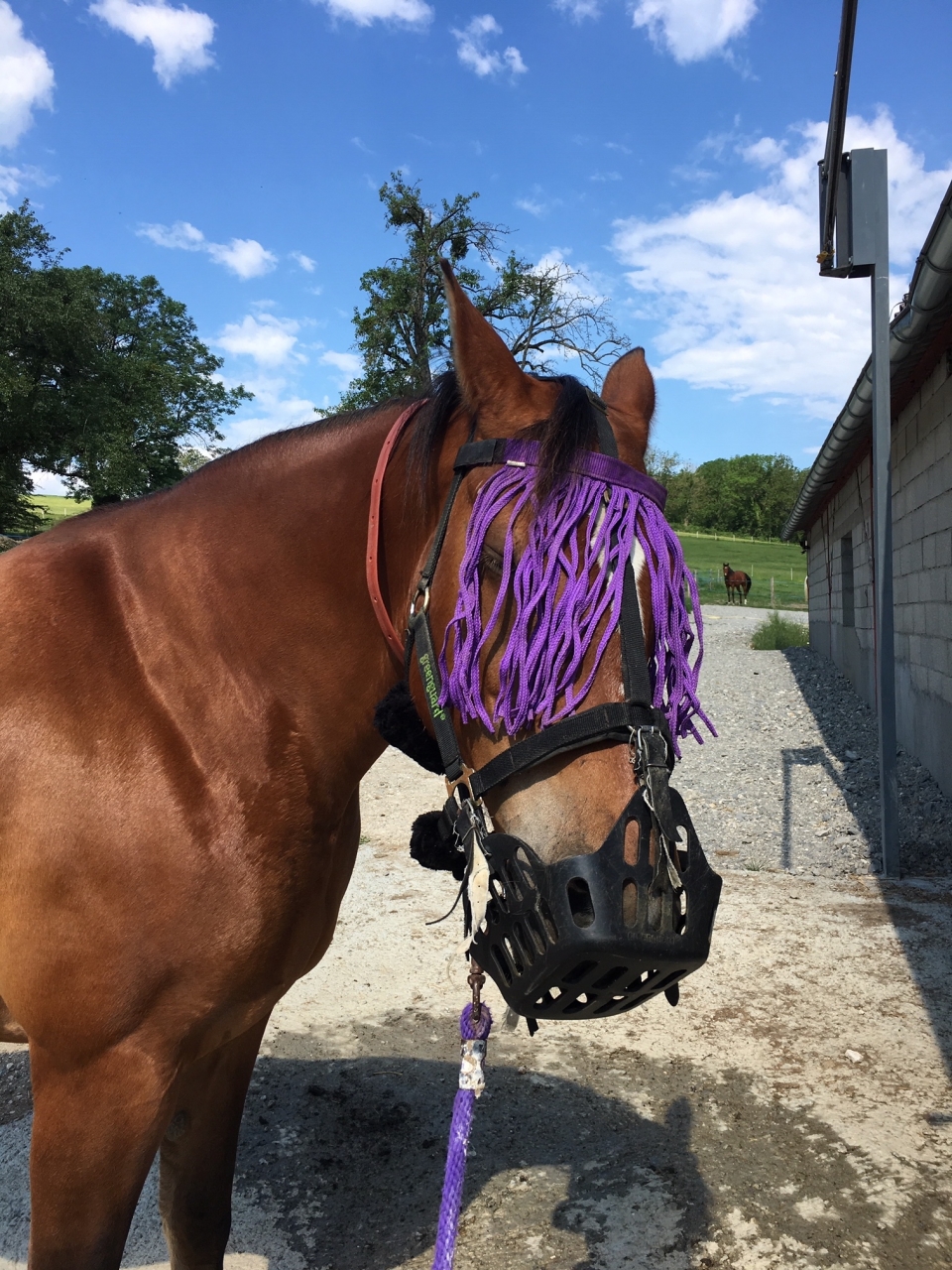 Déconnecté | Bon ça tient pas. Il se retrouve sous le cou ou mieux devant, le bord dans sa bouche ![]() Je vais bricoler une sangle le long du chanfrein, mais bof |
