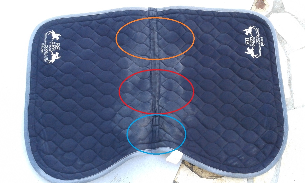 | Dire merci | J'ai l'impression qu'il y a plus un déséquilibre cheval et / ou cavalier ( rond orange et bleu ) et un tout petit manque de musculature ( rond rouge ) ou alors selle un peut trop en avant...çà n'a pas l'air catastrophique...??? alors oui ca c'est sur que mon cheval manque de muscle au niveau de la colonne vertebrale ensuite ma selle est la rexine donc nez coupé le garrot est tres dégagé en fait quand je pose ma selle sur son dos elle est bien droite le siege est bien parallele à son dos, bein derriere l'épaule. mais quand je monte dessus j'ai l'impression que le trousssequin se leve un peu et que du coup elle penche vers l'avant mais c'est vraiment tres tres léger Après, la gouttière est comment ? ( large ou pas si tu l'a sous la main mesure l'espace vide entre les matelassures avant & arrière ), çà à l'air de ne pas bien dégager la colonne mais je n'arrive pas à bien voir sur le tapis par rapport à çà... oui la gouttiere j'y passe mon poing fermé donc elle est bien large Si le cheval dit qu'il est mieux, il faut l'écouter, par contre, ne surtout pas ajouter d'amortisseur... Tu as des soucis de dos ou autre ( genoux, chevilles, hanches...)? çà expliquerait peut être la différence entre droite et gauche... j'ai un probleme de dos (sciatique chronique) et et une jambe plus longue( la gauches est plus longue) que l'autre (1 trou d'étriviere quand meme) |