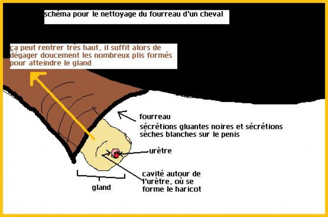 | Dire merci | NON lapatateuh, je parle du fourreau ! Il faut le dire combien de fois ? Quand on passe la main dans le repli de peau, on se rend compte que sur les parois et dans les plis se trouve une pâte collante, noire et sentant fort. j'imagine que ça doit démanger. Ce n'est pas du pipi, swann, les hongres ne s'arrosent pas le fourreau ! Wiktionnaire : smegma \smɛɡ.ma\ masculin Sécrétion sébacée qui s’accumule entre le gland du pénis et le prépuce. (Par extension) (Médecine vétérinaire) Équivalent présent dans le fourreau de la verge du cheval |