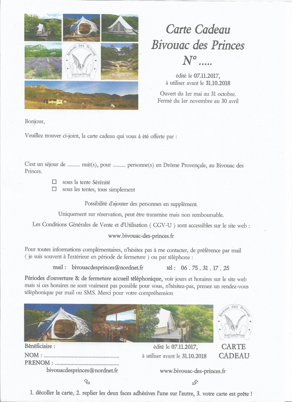 | Dire merci | Rien ne t'empêche d'utiliser tes feuilles spéciales A4. Mais vire tout ce texte !!! Je suis d'accord avec les autres, il y a beaucoup trop de texte. Par contre, tes photos en tout petit dans le coin en haut, ça ne donne pas envie. Mets tes photos en grand, et très peu de texte. Une phrase courte, comme suggérée par Sheytana, mais écrite en grand, bien visible. Je verrais bien également une carte sommaire pour situer l'endroit. Car bien sûr que la plupart des infos, le bénéficiaire pourra les trouver sur le site, mais tout le monde n'a pas la facilité d'aller sur internet. Au moins, visuellement, ça permet de localiser tout de suite l'endroit. Tes coordonnées, bien sûr. Les horaires pour te joindre (et la possibilité de te laisser un message en dehors des heures d'ouverture) La place pour marquer qui a offert la carte cadeau, évidemment. Et la durée de validité. Et à quoi correspond la carte. (et pourquoi pas une valeur indiquée, plutôt que X nuits ? Ce qui permettrait au bénéficiaire de réserver sous la tente de son choix, ou plus de nuits, si la somme offerte ne suffit pas. Par exemple, quelqu'un qui offre une carte d'une nuit, au moins cher, mais que la personne se dise que tant qu'à faire, elle va venir 3 nuits, et préfère prendre la plus belle tente ?) Et puis au dos de ton A4, tu peux imprimer tes conditions générales d'utilisation. Au moins, le bénéficiaire a tout sous la main. |