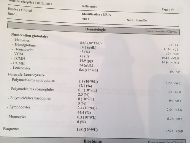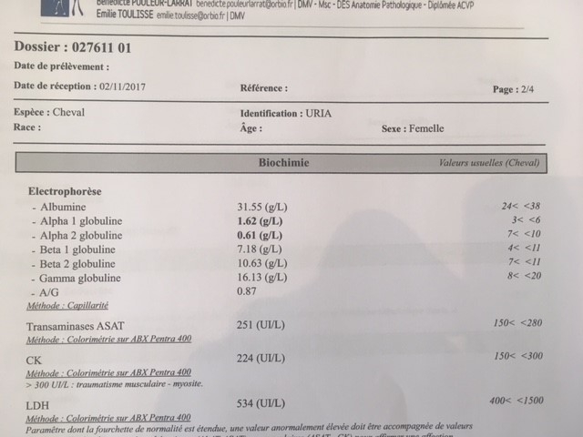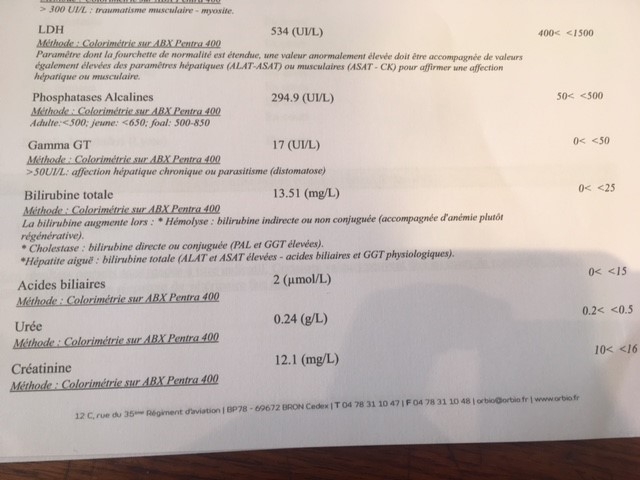 | Dire merci | coucou les vetos du forum. je poste dans l'angoisse car je viens de recevdoir les résultats de la PDS de ma jument et mon veto sera pas joignable avant ce soir voir demain matin... alors voilà, ces taux d'alpha 1 et 2 globuline sont très très bas alpha 1 1;62 g/l Moyenne 3/6 alpha 2 0,61 g/l Moyenne 7/10 Sachant que on a testé la pyro (PCR) et s'est négatif. Lyme et lepto en cours mais négatif en avril et novembre 2016. Jument qui a fait : colique bouchon printemps 2015 pyro avril 2016 (mais sur serologie uniquement et à 1/160) colique bouchon septembre 2016 pyro novembre 2016 (1/360) colique bouchon mai 2017 coup de sang à la suite mai 2017 Colique bouchon juillet 2017. examens faits en juillet 2017 : ulcères grades 3/5, traitement (qui coute un bras), changement de vie avec retour au pré H24 et foin à volonté + complément spécial ulcéreux. Ne fait quasi rien depuis 6 mois, arrêt de toute activité sportive,quasiment pas montée si ce n'est deux / trois séances très cools en septembre. autres signes de la jument : muqueuses pâles et très molle/ fatiguée montée alors que c'est normalement une gentille fusée (arabe un peu féléé de son état naturel). voilà, là, j'angoisse à mort. je pense insuffisance hépatique grave et imagines le pire. et comme je peux pas avoir le veto, je vous interroge, vous, les savants. Merci de votre aide |