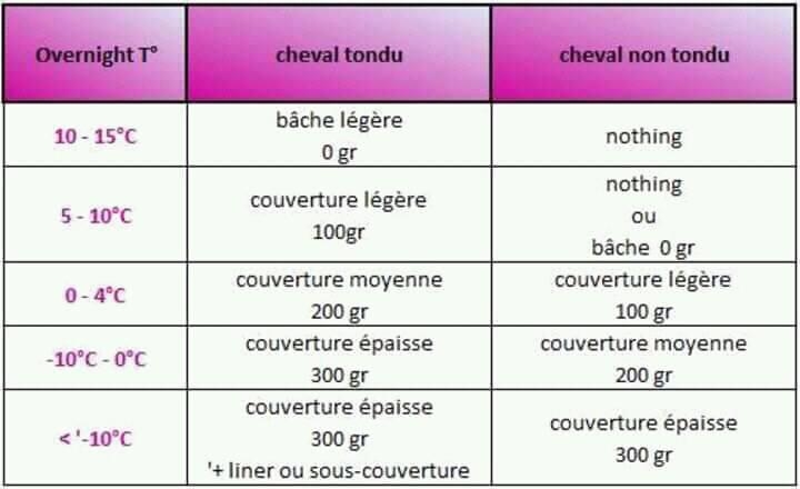 | Dire merci | moi je ne suis absolument pas ok avec ton tableau Un 200gr en hiver dans le sud sur un cheval tondu à 1mm je n’y crois pas. Et ne pas mettre de couvre encolure est un gros tord. Tout cheval tondu doit en avoir un ça évite bien de problèmes après au travail. Chauffer une maison fenêtres ouvertes revient au même. |