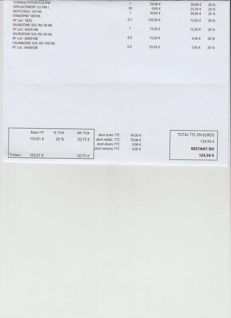 | Dire merci | Il te marque 30km de déplacement donc prenons en gros 30min (au minimum) sur la route. Le temps qu’il arrive , fasse une anamnèse, fouillle, s’occupe du protocole , regarde l’évolution... s’il ne passe pas concrètement 1h avec le cheval je ne vois pas comment une colique est possible ... Donc MINIMUN 1h30 pour 29e ? Car le reste ce n’est que des médicaments. Il dévalorise la profession , ses études et son savoir. |