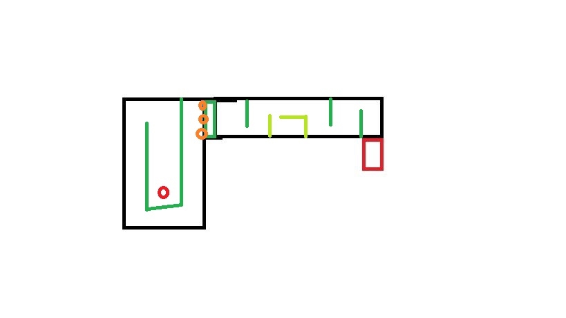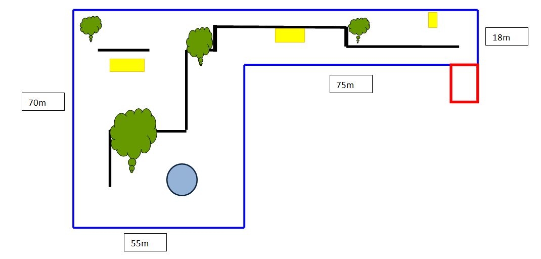 | Dire merci | ![]() Voilà le terrain (d'un seul tenant). En rouge, c'est l'accès qui descend à l'abri (accès fermé en journée, abri ouvert sur une grande parcelle en herbe pour les minces), en vert, un mini talus de 30 cm. Le reste de la parcelle est plate. |