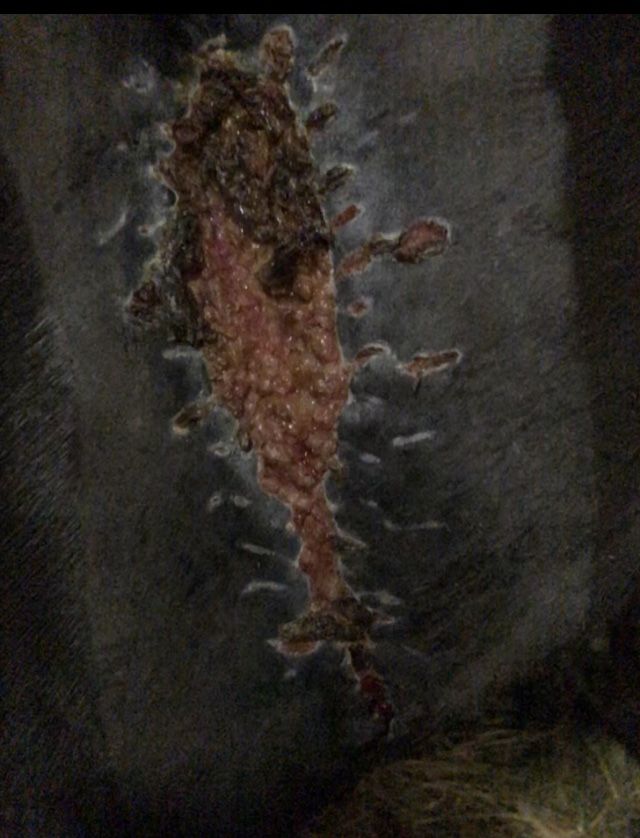 | Dire merci | Vaseline nan je suis pas pour , jsui pas une adepte de la vaseline en général Lapatateuh je pense qu’il va garder des séquelles de ce truc moi , j’ai peur que une fois cicatriser il garde une zone de peau dur et plus raide dans le boulot Je ferais tout pour essayer de réparer au mieux peut être que avec plusieurs mois de massage derrière avec genre de l’aloe Verra ont aura du mieux Bon ce matin mon pansement que j’avais fais hier n’a pas tenue j’avais imbibé des compresse de ema mais au moin la plaie est belle sans croûte au premier coup d’œil Jvai aller faire mes box jvai retirer le reste du bandage et lui remettre un peut de ema liquide examiner le truc et voir si je refait le même pansement cette après midi j’aimerais tester les ema quelque jours pour voir si la chaire ce comble plus vite dans le trou |