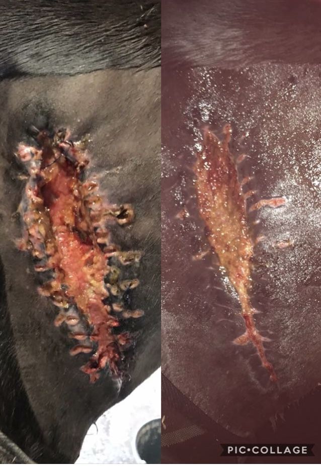 | Dire merci | Bonjour il y’a 15 jours mon cheval m’a fait une piro , mon veto lui a fait une première injection au niveau jugulaire il m’a laisser le traitement ( carbesia ) en attente des résultats de la pds le soir meme après avoir eu les analyse je lui fait la première injection et le lendemain l’autre Le lendemain un œdème moue apparaît au niveau jugulaire Je préviens le veto qui me conseil de mettre de l’argile Depuis ce temps l’œdème c’est un peut résorbé et est devenu plus dur et plus au niveau de l’encolure là où j’ai piquer Aujourd’hui je m’aperçois que sa coule je pense que l’œdème ce transforme en abcès Je vais aller lui doucher pour retirer le reste d’argile Avez vous déjà eu des cas similaires ? Que conseiller vous ? |