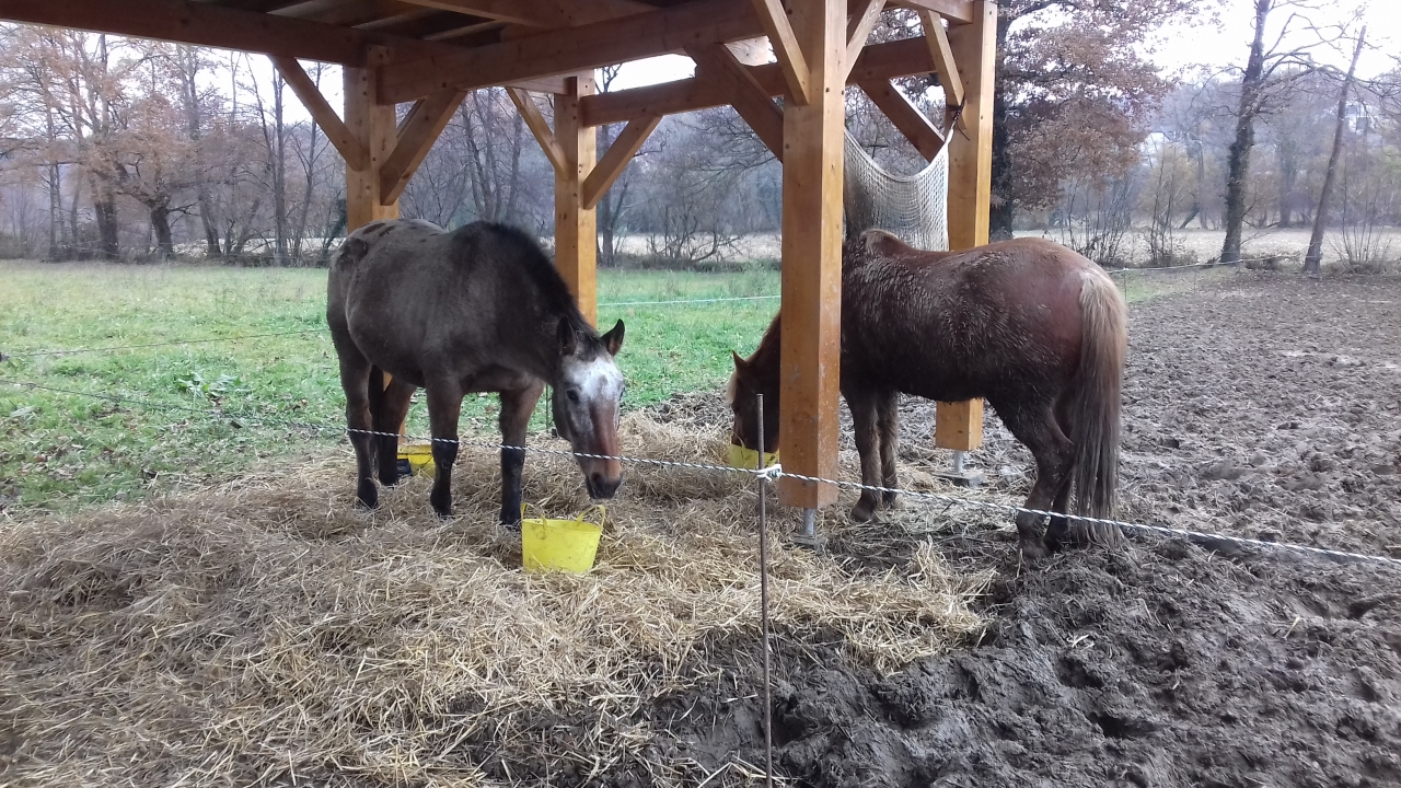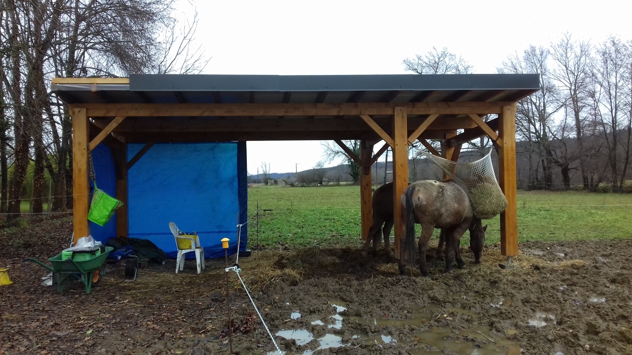 | Dire merci | Bonjour oumcalin ! Tu as combien de surface pour combien de chevaux ? Au début j'avais des zones de refus en herbe et puis même ces zones là son devenues de la boue... Heureusement qu'il y a l'abri ! C'est pas un carport. Mon compagnon travaille dans le bâtiment alors il a carrément commandé la structure à son fournisseur de charpente traditionnelle ! C'est beaucoup de boulot à monter mais c'est vraiment le top : solide et esthétique. Je suis en train de terminer le toit en bac-acier. ![]() Quand il fera beau, cet été, je ferai le bardage et l'année prochaine, les chevaux auront accès à la partie gauche de l'abri. A droite, je vais aménager un petit local pour le fourrage, licols, couvertures,...). ![]() Sur la deuxième photo, les chevaux avaient accès depuis quelques jours à l'abri et le sol est encore boueux. Mais à force d'ajouter de la paille tous les jours, ils ont maintenant un bon matelas avec du fumier pour l'isolation du froid et de l'humidité, et de la paille propre par dessus tous les jours. A la fin de la semaine, je vais chercher des copeaux dans une scierie pour améliorer encore leur confort :-) |