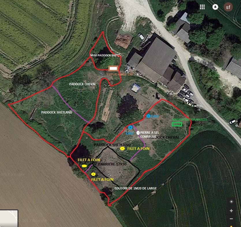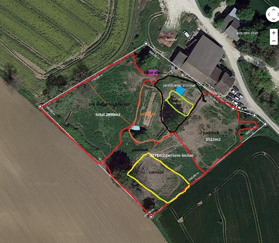 | Dire merci | Heco ah oui c'est sûr ca aide !! tip top en tout cas ton abris , ca c'set du solide c'est sûr ! nous on a un ami qui bossait dans le batiment il est venu hier pour voir l'emplacement du futur abris et va nous faire un devis pour un 3x5 en bois sinon pour répondre à ta question voici un plan que j'avais posté sur un autre post : ![]() en ce moment mon cheval est dans celui qui fait 1522 m2 et mes deux shets dans celui de la carriere (sauf qu'ils n'ont pas acces a celle ci sinon ils me la ruine...) |