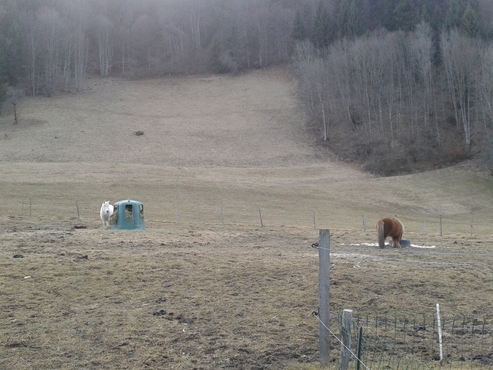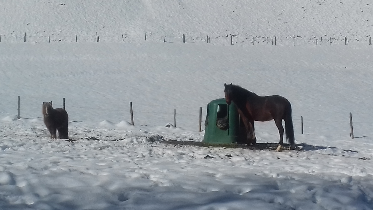 | Dire merci | Je vous remercie pour vos retours ! En fait j'ai déjà la cloche (celle qui est sur la photo). Ca fait un moment que je regardais pour en acheter une et l'année dernière un voisin avec 2 chevaux est partie vivre au portugal avec toute sa troupe. Je lui ai demandé s'il la vendait et je l'ai eu pour 200 € au top !Par contre, jusqu'à maintenant je me fournissais en petite botte (ça m'arrangeais pour la manipulation) ou même en vrac (un peu de foin que je faisais moi même). En fonction du temps je donnais ce qui leur fallait pour la journée dans la cloche. En plus, dans l'abris, elles avaient du vrac dans un filet à foin. Mais là mon fournisseur m'a lâché. Et comme maintenant j'ai la cloche et vu le timing (trouver un fournisseur de petites bottes c'est déjà la galère mais en février c'est à oublier !), c'est beaucoup plus facile de trouver des balles rondes. Je suis en montagne, par chez nous il font de petites balles rondes qui rentrent dedans la cloche . J'en avais eu une l'année dernière (d'ailleurs sur la photo elle est dedans). Mais j'aimerais éviter le gaspillage et donc je me demandais s'il serais utile d'investir dans un filet à foin pour round en plus de la cloche... |