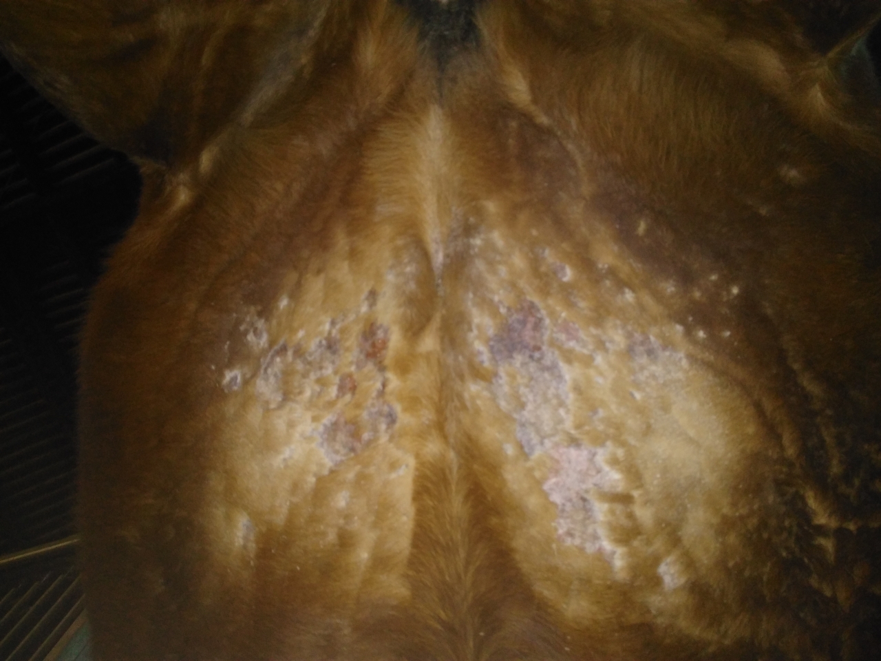 | Dire merci | Voilà. Je vais exposé le cas de la jument Bwp de 19 ans vivant en stabulation libre sans couverture. Il y a deux ans à la même époque elle a perdu un peu de poil de part et autre dans le bas de son ventre. Ça faisait deux petite plaque sans poil. Peau lisse. Et puis ça a repoussé Il y a un an idem au même endroit. Mais cette année. Ça a commencé pareil mais la Ça la demange beaucoup et ça a pris des grosses proportions. En plus du poil qui part par plaque cela fait des croûtes qui dessous suinte. On a fait une pds et des analyses de peaux + cultures. Résultats une anémie (manque 1milion de g.rouge) mais rien aux analyses. On ne sait pas ce que c'est. Vu que ça grandit de jour en jour. Avez vous une idée de ce dont il peut s'agir ? Aucun autres chevaux n'est atteint. Pour le moment j'ai coupé les poils autour pour me faciliter les soins. Ajd j'ai juste mis de l'isobetadine faute de mieux (la véto m'a conseillé savon de Marseille + he tea tree et lavande) Si vous avez des pistes à explorer... |