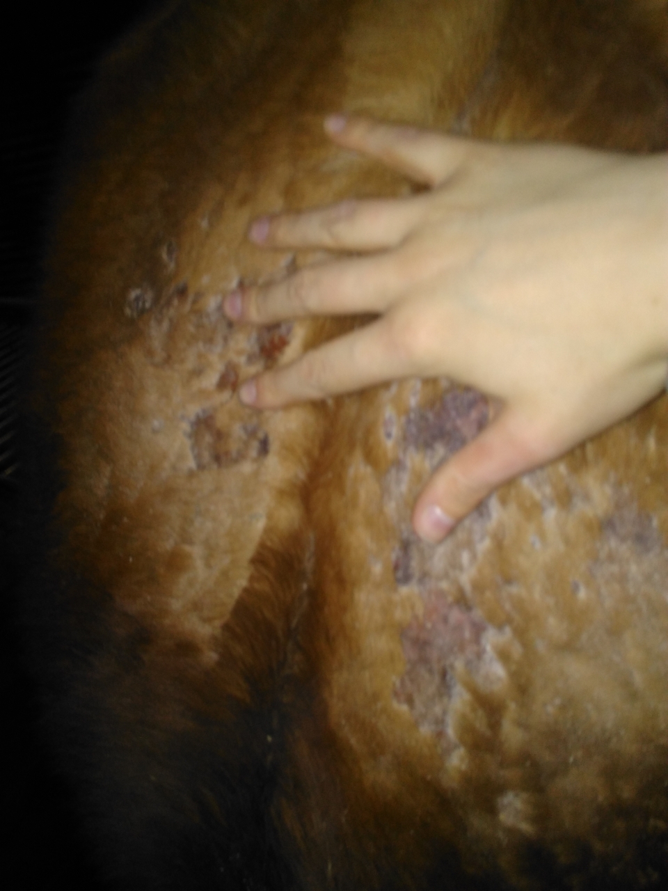 | Dire merci | Alors l'hiver elle a de la paille - du préfa et des grains. L'été elle n'a rien mais me fait d'autre soucis (sensible au soleil au niveau du blanc du nez - liste et balzane) Niveau news - la véto repasse demain. Actuellement grace à la creme hier toute les croutes sont tombé aujourd'hui - laissant une peau lisse plutot clean, donc je suis assez soulagé, ce n'est plus moche. Mais par contre ca continue de se répandre et de la démanger +++. |