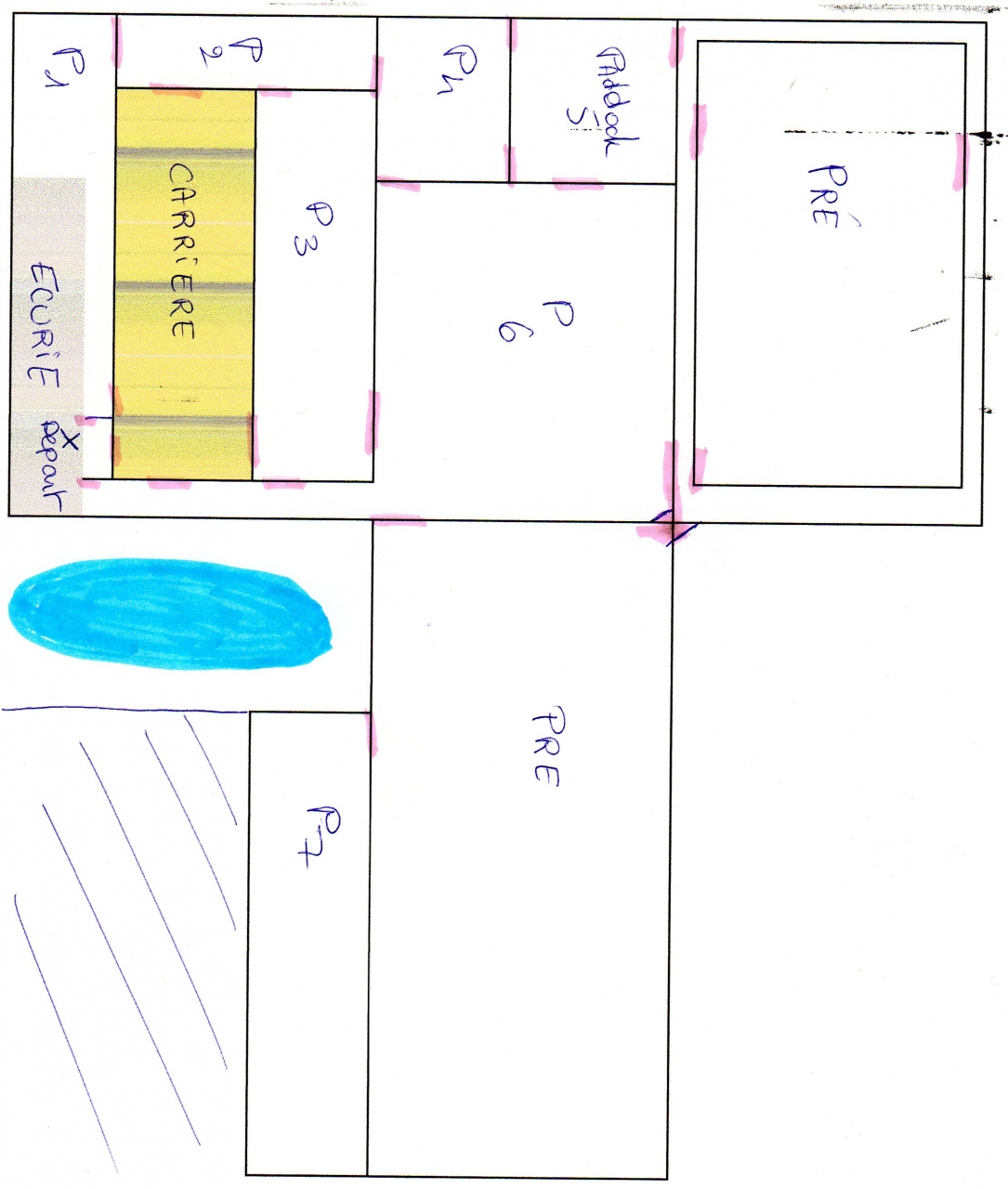 DéconnectéDire merci | Voici le plan. Tous les traits roses indiquent les entrées de pré ou paddock (je sais pas pourquoi ça ne prend pas l'image dans le bon sens)![]() |