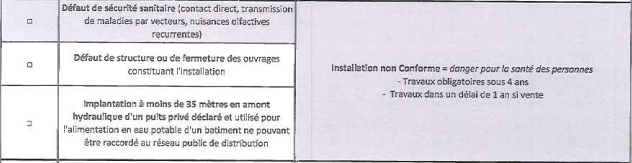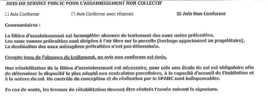 | Dire merci | Merci, je suis rassuré par vos réponses! Pour le temps de repos des pâtures, cela va malheureusement dépendre de la date effective de la vente, de quand les moutons seront retirés des parcelles et de la date de notre déménagement... mais si un traitement à la chaux reste la meilleure solution, ce sera aussi la plus facile et économique! D'après les informations fournies par le propriétaire et l'agent immobilier, la vidange doit être faite tous les deux ans et n'a pas été faite depuis au moins deux ans. D'où les débordements dans le pré. La fosse et le tuyau se trouvant tout en haut de l'herbage, et le-dit herbage étant fort pentu, ça dégouline. Voici les conclusions du diagnostic de la SPANC ![]() ![]() |