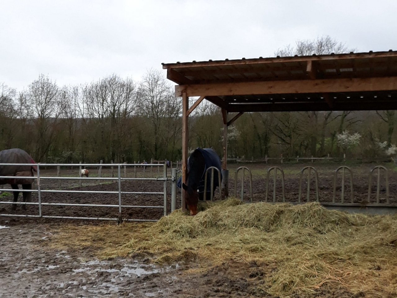 | Dire merci | Perso, je stocke mon foin en round dans le pré, sur palettes, avec des bâches. Au bout de quelques années mon système est au point, et avec deux épaisseurs de palettes sous les round, et une épaisseur sur les côtés, ça ventile bien et je conserve mon foin tout l'hiver. Je l'ai fait rentrer ce mois-ci, donc pas de souci pour le stocker, le tracteur est rentré dans le pré, et m'a tout livré et tout mis en place. On ne me les empile, comme ça je peux les manipuler facilement à la main. Il se trouve que dans ma nouvelle maison, une partie de l'accès est stabilisée : l'entrée du pré, et jusqu'à l'abri. Donc j'ai mis le foin de façon à ce que ma zone de stockage donne sur la partie stabilisée, ce qui m'évitera les galères de brouettes qui s'embourbent que j'ai connu les années précédentes. Le fait d'utiliser des filets, comme l'hiver dernier, ça aide aussi. En, fait il faut vraiment essayer de se réduire au maximum les manipulations et les trajets dans la boue. le top c'est évidemment de pouvoir accéder de l'extérieur et de ne même pas avoir à entrer dans le pré, mais ça, la configuration des lieux ne le permet pas toujours. |