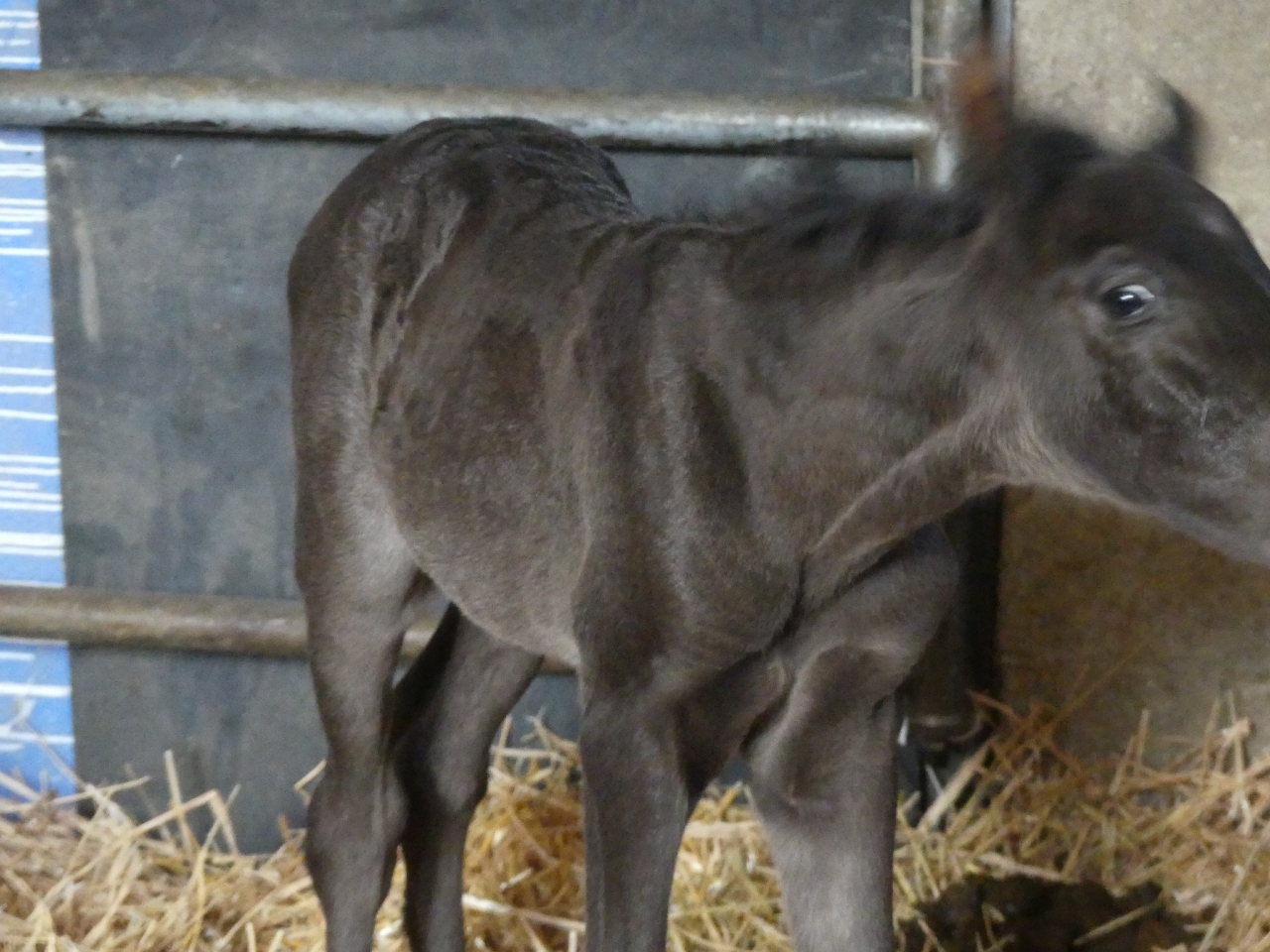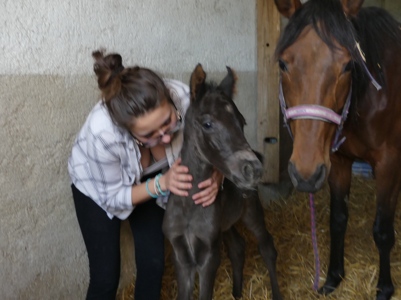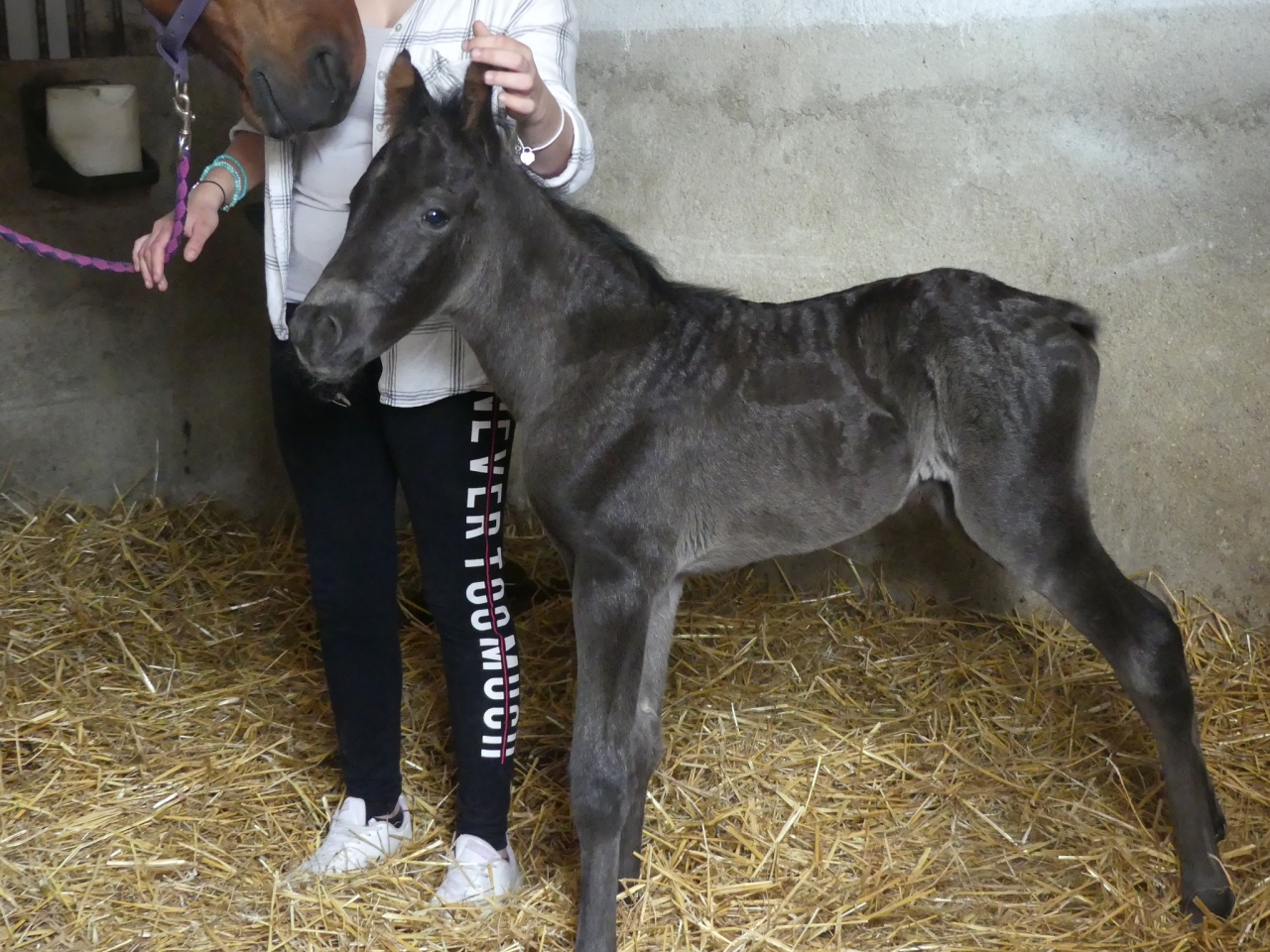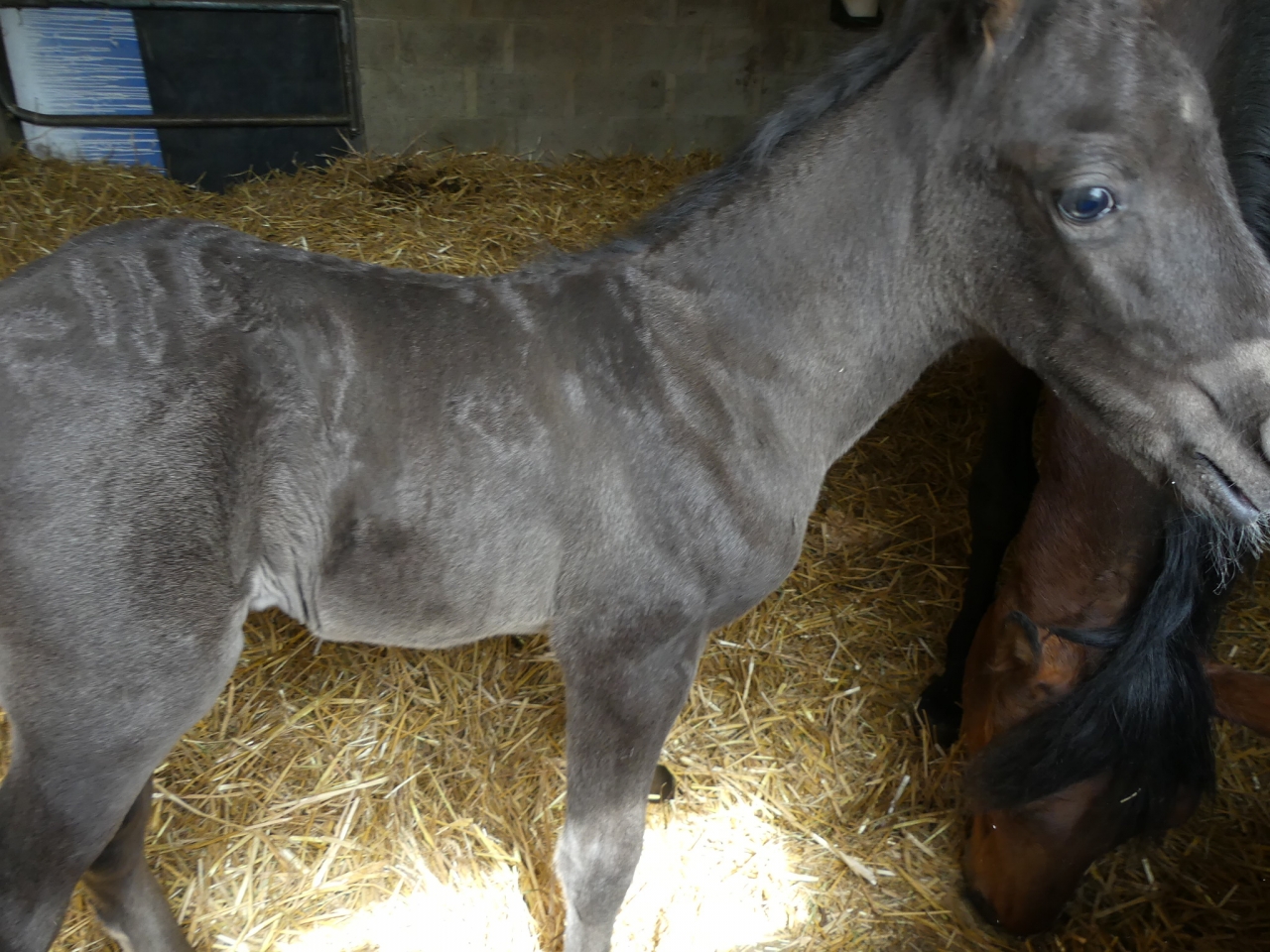 | Dire merci | Vu les parents, il peut être alezan, noir ou bai. Vu la couleur à la naissance, je dirais bai (dans toutes ses variantes). Il est un peu foncé pour être noir même si ça reste possible. |