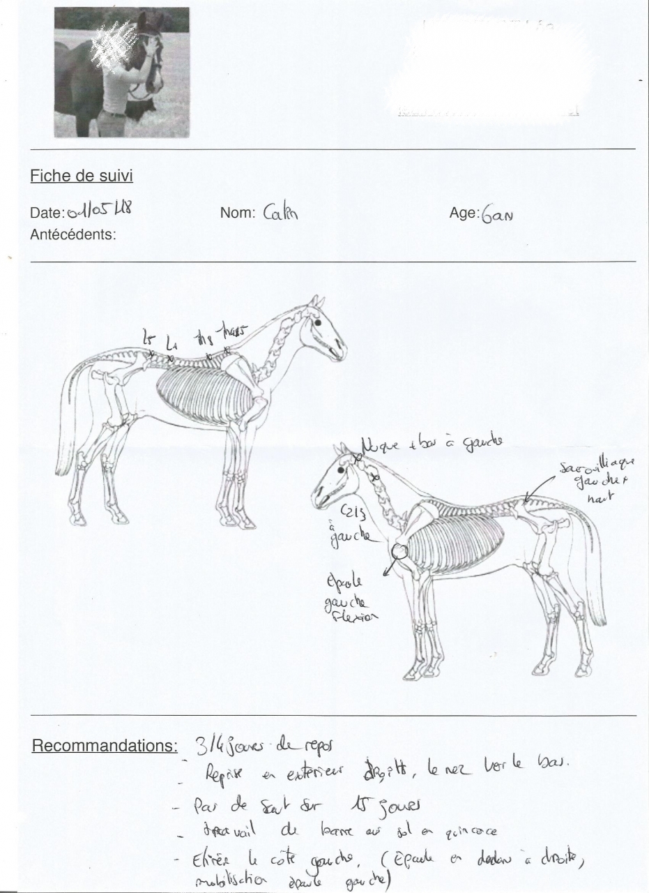 | Dire merci | Perso, la fiche d esuive de mon chevaal permet de mettre ceci en archive et de le ressortir à ue prochaine visite où bc de temps peu s'être écoulé, je peux mal me souvenir. C'est comme ressortir une ordonnance pour le suivi médical, que ce soit humain ou vétérinaire. Par ex, là, je vais consultéé un spé poru un de mes animau, qui a été durant de smois suvi par un autre, je suis contente d'avoir toutes le sordonnances poru pouvoir donner tout le suivi qui a été rellement fait. Je trouve ca bien, mêem si j'ai assez bonne mémoire et que je m'interesse de pret à la médecine véto et au suivi de mes animaux; Je ne pense pas que uiconque ai écris ici qu'un ostéo pourrit remplacer un véto ou un examen approfoondit. Pour moi, l'un n'est pas incompatible avec l'autre. Il y a 2 ans, j'ai fais venir un véto pour jument douloureuse : pas trouver la cause. Je fais venir un ostéo : suspission (je parle bien de suspission pas diagnostique posé et assuré) suspission de douleur ovarienne du à un corps jaune persistant ou kiste. Je fais donc appel au véto spé équin (pa sprsi en prmeière intention car loin de chez moi, faut que je pose une journée pour pouvoir aller fair eune écho). Echo qui confirme bien le corps jaune persistant, traitement médicamenteux mis en place. J'aurais pu consulter le véto spé équin directement mais ca n'aurait pas empecher de voir l'ostéo pour réoudre le reste, dont de sblocage musculo squeletique du aux douleur à l'ovaire concerné; |