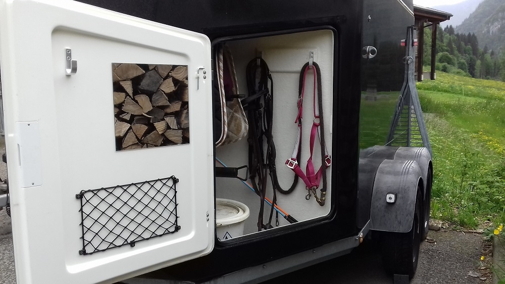 | Dire merci | Chez bookmann ils font la sellerie intégrée avec une porte qui ferme à clé, on y loge 2 selles, tapis, filets. C'est vraiment pratique, quand je vois mon 4x4 blindé jusqu'au toit sans les selles et tapis |