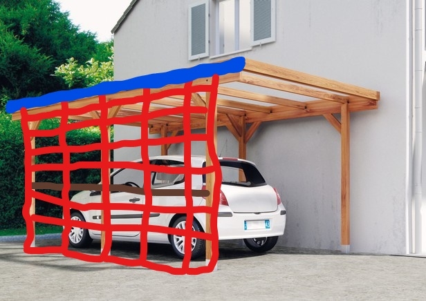 | Dire merci | un truc dans ce genre ? trait marron à l'horizontal : chevrons à 1 ou 2 hauteurs différentes ( en fonction de la rigidité des plaques si tu prends çà ) pour fixer les murs grille rouge : murs ( selon le choix fait ) trait bleu toiture qui déborde tout autour de l'abri pour éviter que la pluie s'infiltre par là Attention au sens de chevauchement ( si y'en a ) pour que l'eau ruisselle correctement le long des parois et sur la toiture... ![]() |