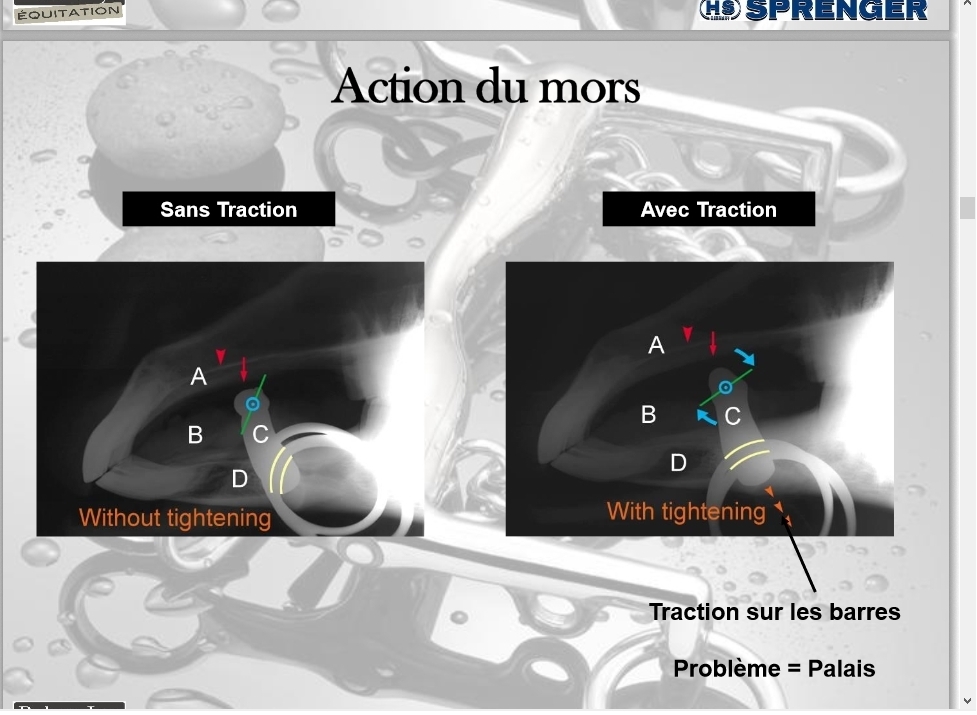 Déconnecté | Pour les mors où il n’y a pas de gourmette (mors Baucher, Pessoa…) quand le cavalier aura une action de main, l’anneau du haut (là où le montant du filet est accroché) va basculer vers l’avant. Ceci a pour conséquence d’appuyer sur la nuque et donc de la faire céder. Le mors va ainsi remonter dans la bouche pour agir sur la commissure des lèvres. ==> C’est ça l’effet releveur. Il y a quatre erreurs dans ces quelques lignes : (1) On ne peut pas mettre le Baucher et le Pessoa dans le même panier, puisque leur montage est exactement inverse. (2) La pression du cuir sur la nuque est negligeable par rapport à celui de l'acier dans la bouche. Si on remplace le cuir par un câble d'acier alors la oui il y aurait probablement un effet (catastrophique je pense, voir 3) (3) En admettant même que la pression du cuir puisse avoir un effet (ce qui n'est pas le cas) cette pression s'exerçant vers le bas, le long des montants du filet, elle aurait pour effet de baisser la nuque, pas de la fermer, donc aucun effet sur la mise en main. Dans ce cas cela serait contradictoire avec l'effet releveur (bonjour l'intérêt du truc). (4) Le Pessoa ne fait pas qu'agir sur la commissure des lèvres, car pour ça un simple filet, comme le Baucher (car il en est un, mais c'est un autre sujet) suffit. La caractéristique spécifique du Pessoa, comme de tous les releveurs est d'approcher le mors des dents pour intimider le cheval, et lui faire relever la tete. Les effets des mors sont complexes à comprendre car comme je l'ai dit, les effets mécaniques promis, qui servent comme arguments de vente, n'existent pas réellement. Tout dépend du moment où le cavalier cède, et de la douleur que le cheval peut encaisser jusqu'à ce qu'il comprenne. |