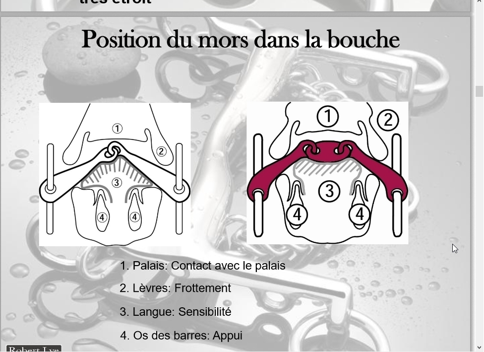 | Dire merci | Il n'y a pas des études sérieuses avec capteurs etc sur les effets des mors ? C'est la question que je me pose, et c'était celle que posait l'article auquel je faisais référence à la page précédente. ![]() Les sensations dans la bouches sont les mêmes que pour nous, mêmes os, mêmes muqueuses, mêmes terminaisons nerveuses Ensuite bien sûr il y a les différences anatomiques entres individus mais la sensibilité des différentes zones est comparable. Certes, mais par exemple certains schémas qu'on voit souvent avec les zones de douleur et les histoires de mors qui tapent dans le palais, etc... ne me convainquent pas en général. Souvent ils exagèrent l'angle de la brisure (alors que quand on compare à la largeur de la tête du cheval, il y a forcément des limites à l'angle du pli du mors). Bref, il y a des tas de discours qui se veulent scientifiques et argumentés, et qui ne reposent pas sur grand chose. Message édité le 31/05/18 à 12:20 |