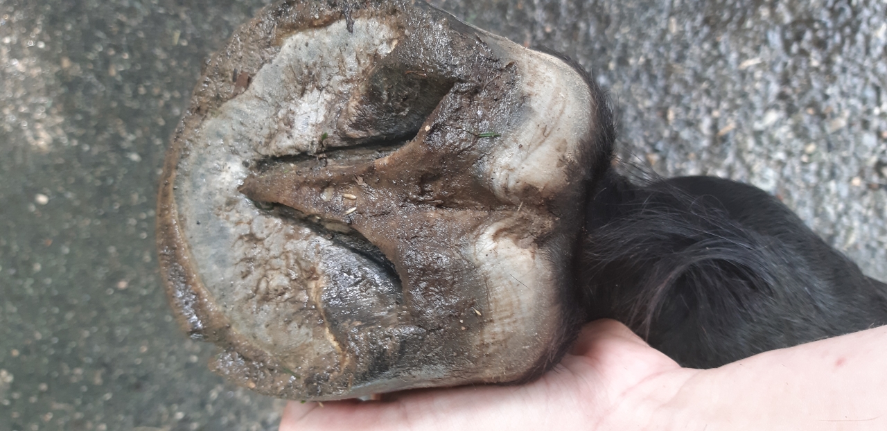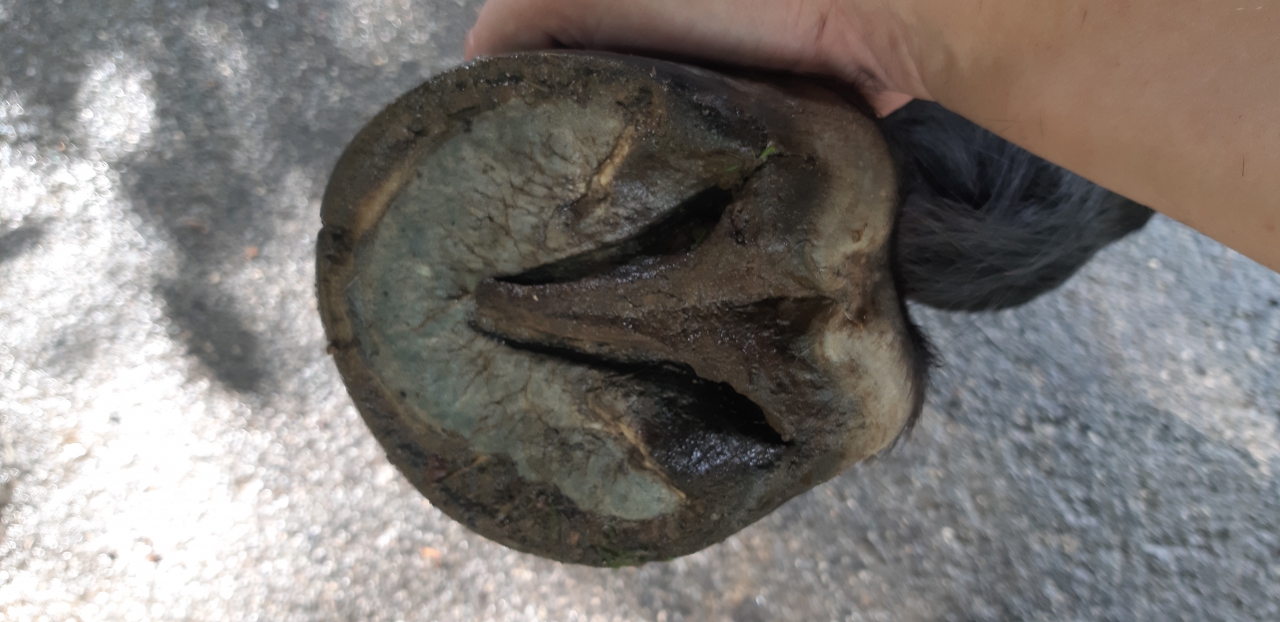 | Dire merci | Houla, tout le monde a l’air catastrophé par ces photos. Oui, le pied est un peu long Oui, il doit être paré Mais pas de cata On voit la paroi qui est un peu concave, signe d’evasement et de déséquilibre, mais ça se corrige facilement La vue plantaire n’est pas si mal, la fourchette a une taille correcte. Bref, work in progress. |