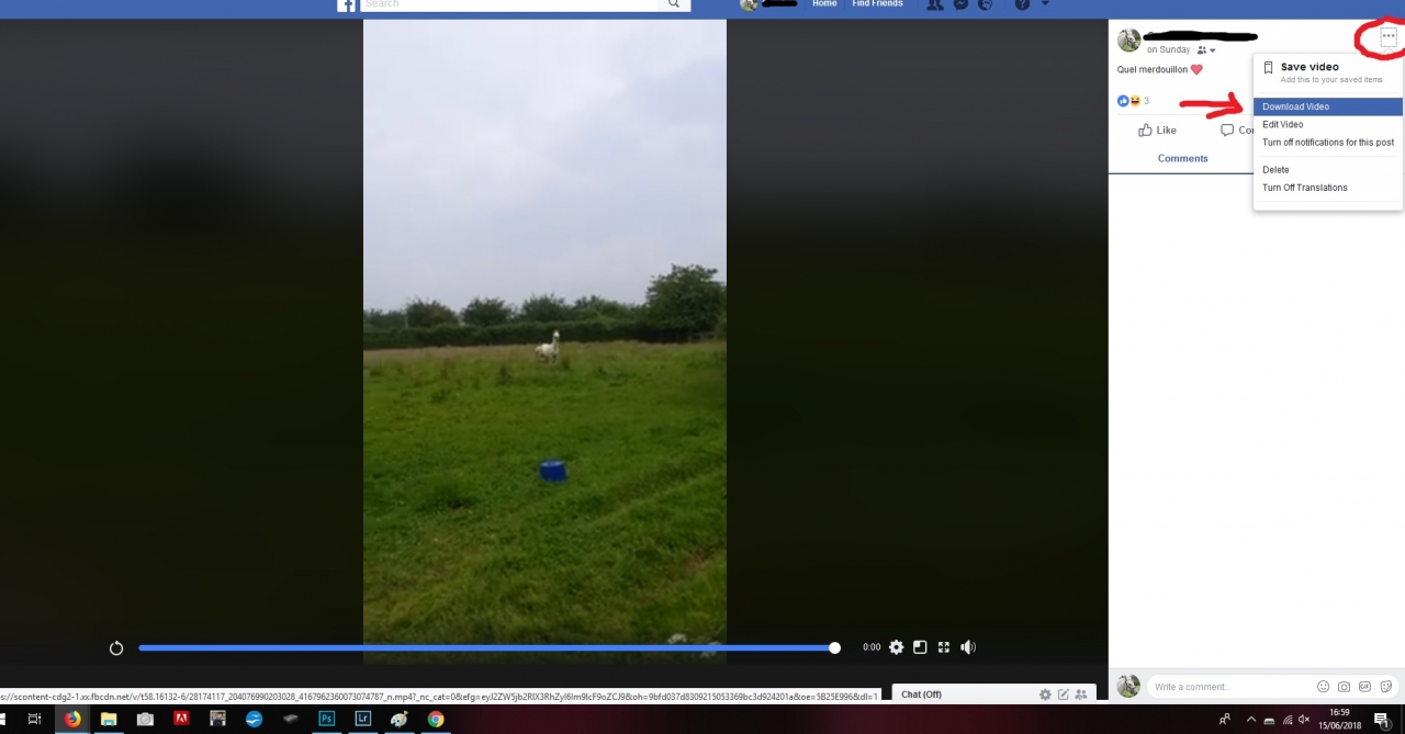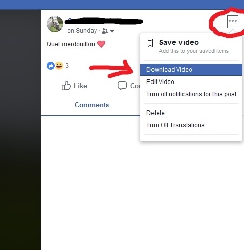 | Dire merci | Hello ![]() Quand tu regardes ta vidéo en grand sur FB, normalement en haut à droite tu as trois petits points, icône : "..." Je te fais une capture d'écran ça sera plus clair. Tu cliques sur cette icône, et tu as l'option "télécharger" ![]() En revanche FB dégrade beaucoup la qualité des vidéos à cause de la compression qu'elle fait quand tu les upload, ça ne sera pas la qualité originale. |