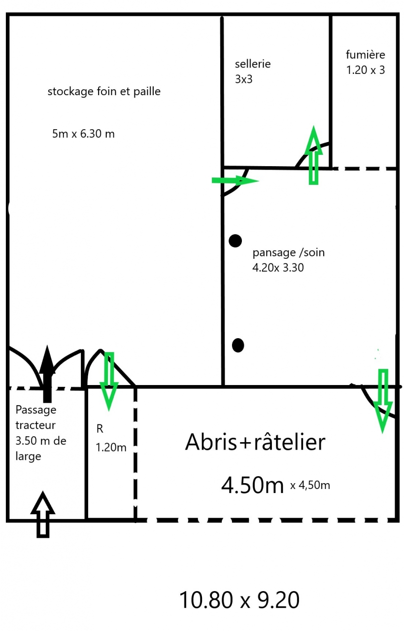 | Dire merci | J'ai dessiné vite fait (et écrit encore plus mal )Là, j'ai dessiné 10*6, ca ne me laisse plus de dalle béton, à la sortie de l'abri, mais il sortirait sur la dalle en grave ternaire, donc ça pourrait aller, ou passer sur du 10*5, pour garder un peu de dalle. La, ça me fait une entrée sud- sud-ouest. Le foin reste à volonté mais dans le stockage, donc manutention top. Le passage de 80cm est limite pour aller à la sellerie + attache (ça leur fera travailler les passages étroits ), non, en vrai est-ce suffisant?Et 3m20 pour l'attache. ![]() |